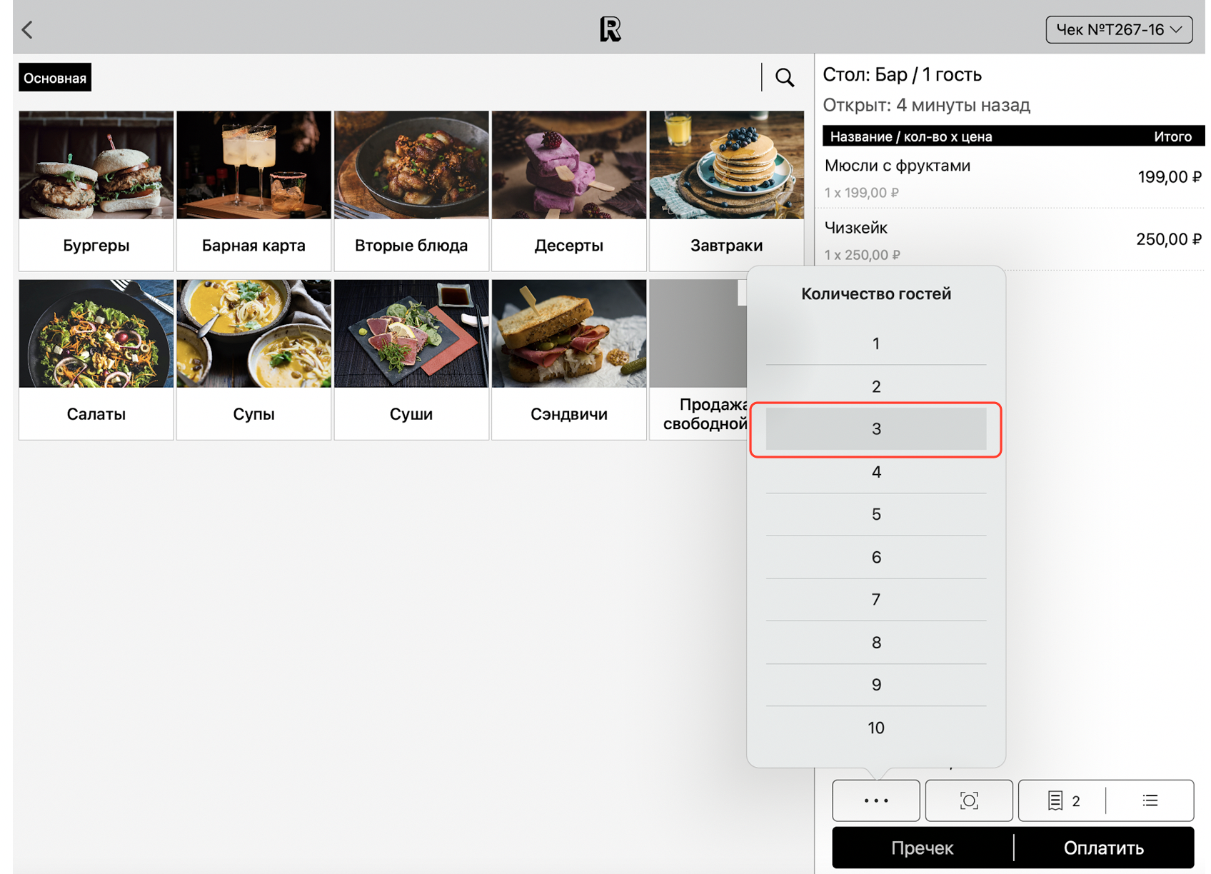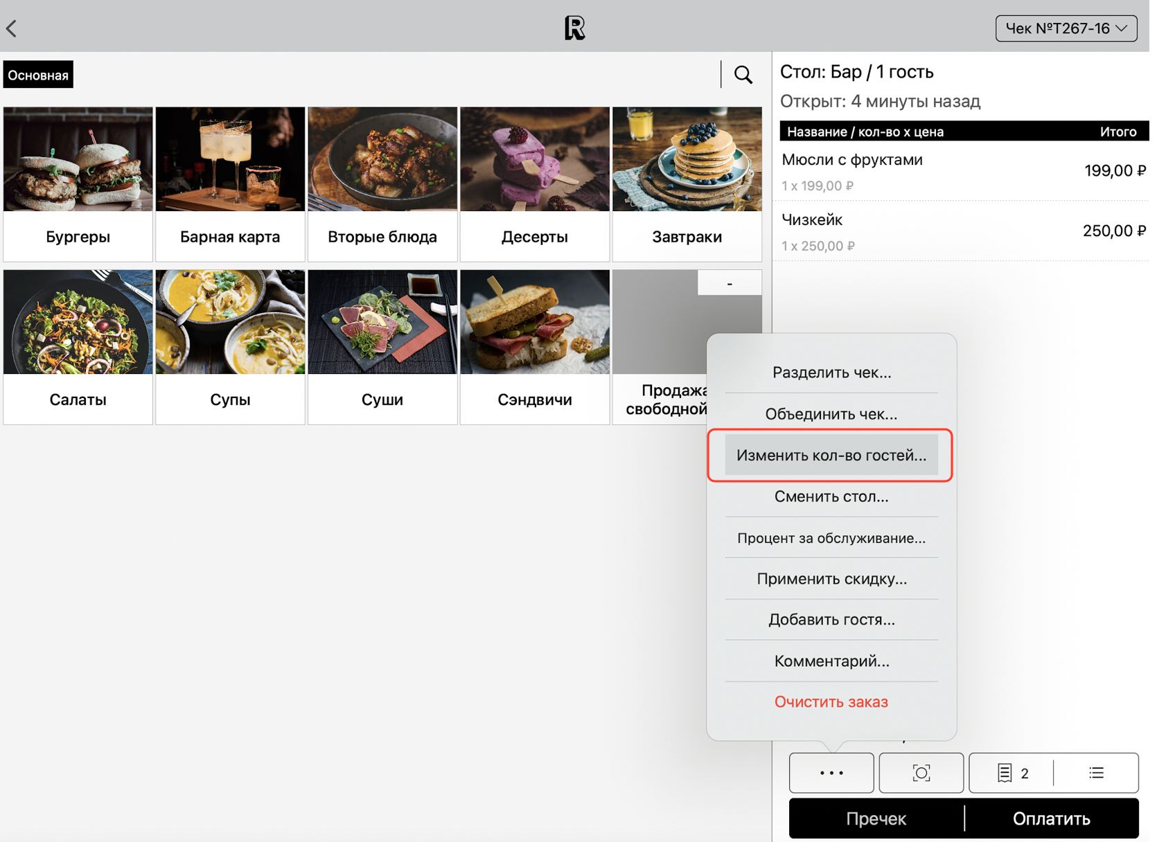 Чтобы изменить количество гостей перейдите на экран чека и нажмите на кнопку с тремя точками в нижней части экрана, затем нажмите кнопку «Изменить кол-во гостей...».