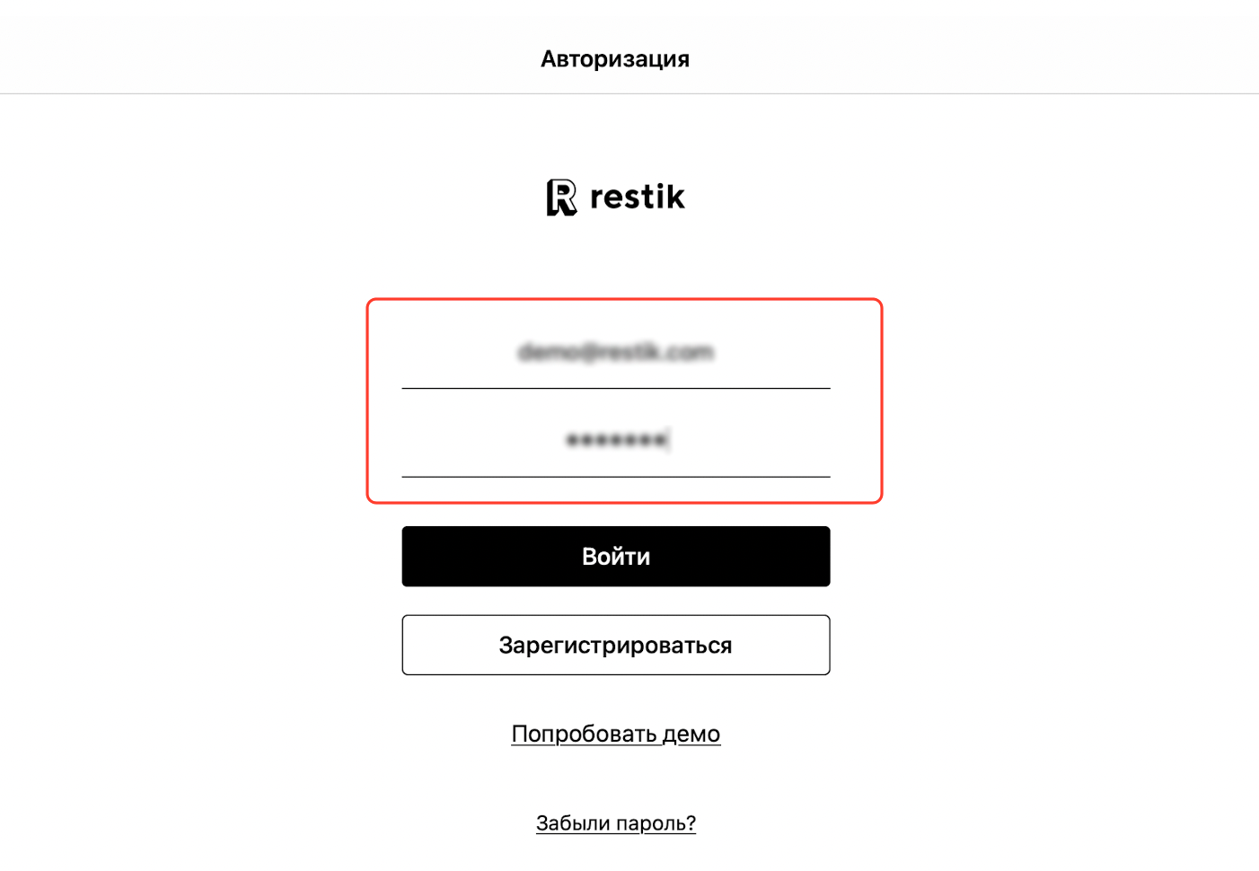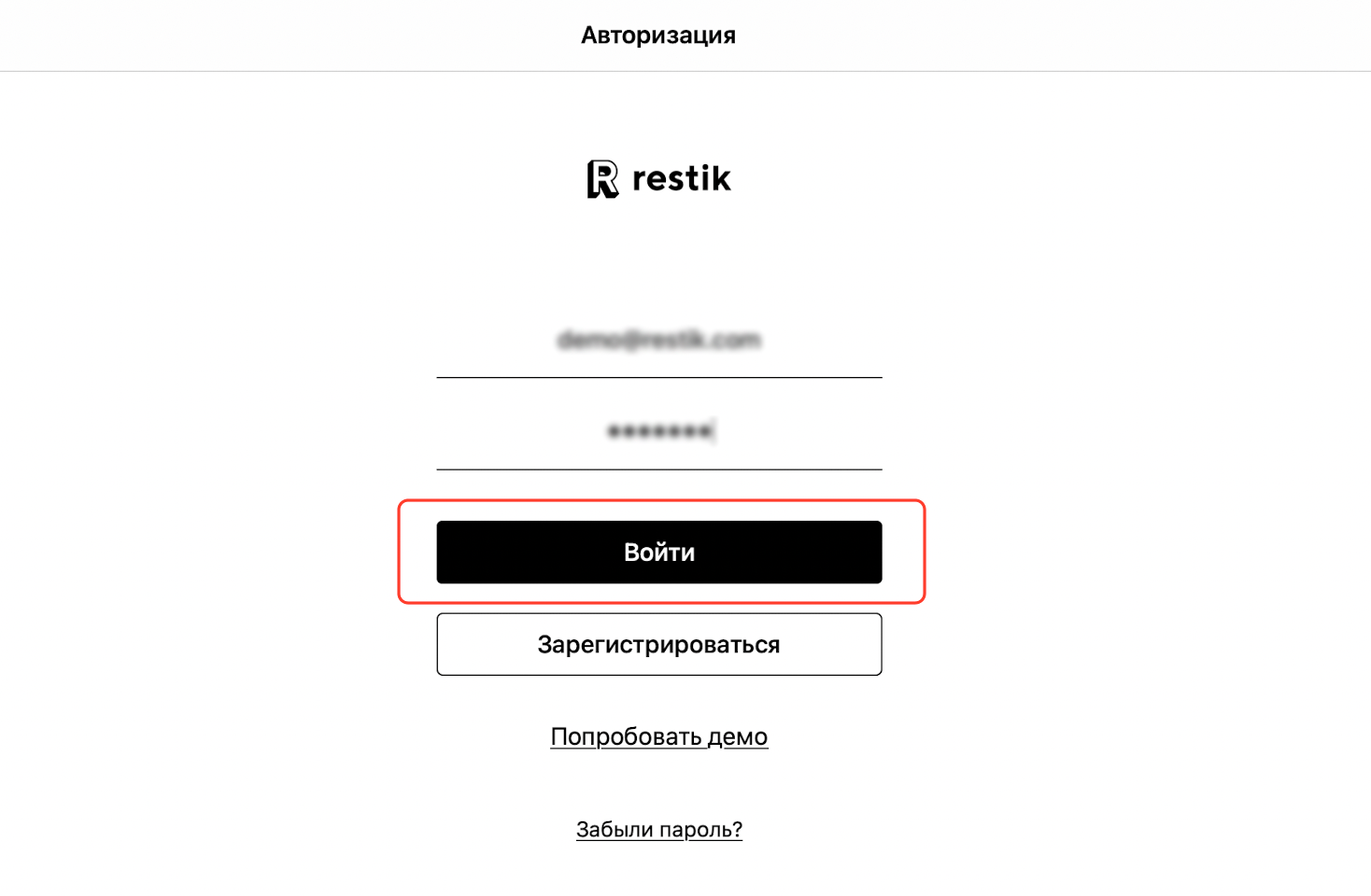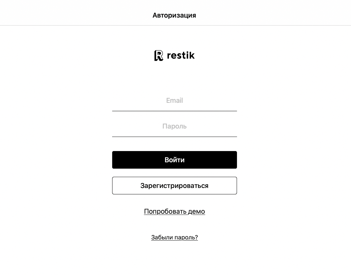 Откройте приложение Restik POS. Вы увидите форму входа в аккаунт вашего заведения:
