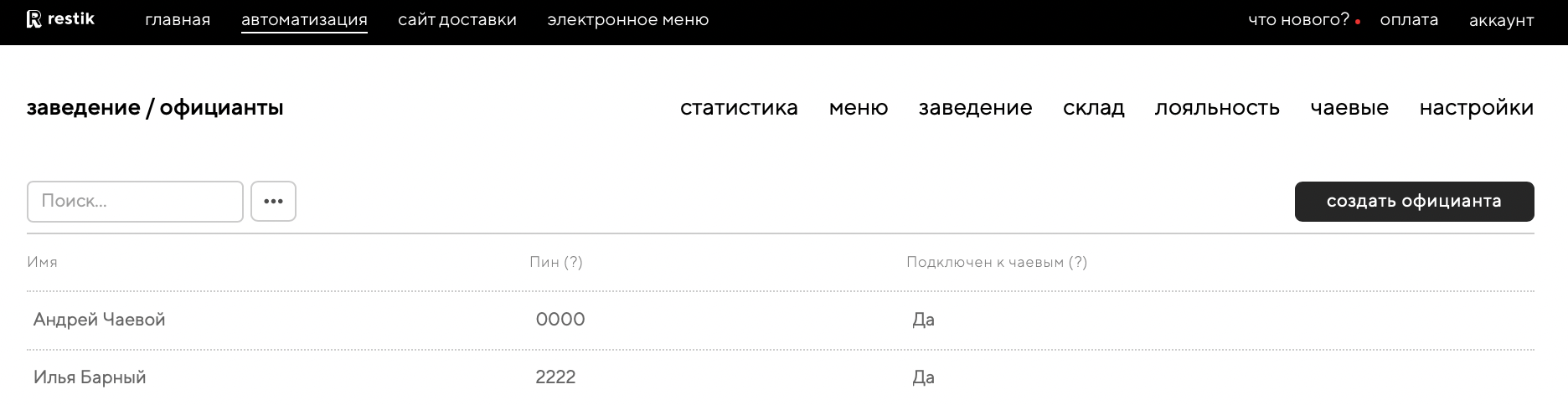 Проверьте, есть ли в вашем аккаунте созданные официанты. Это можно сделать в разделе «Заведение — Официанты». Если официантов нет — их нужно добавить. Подробнее про создание официантов в статье.