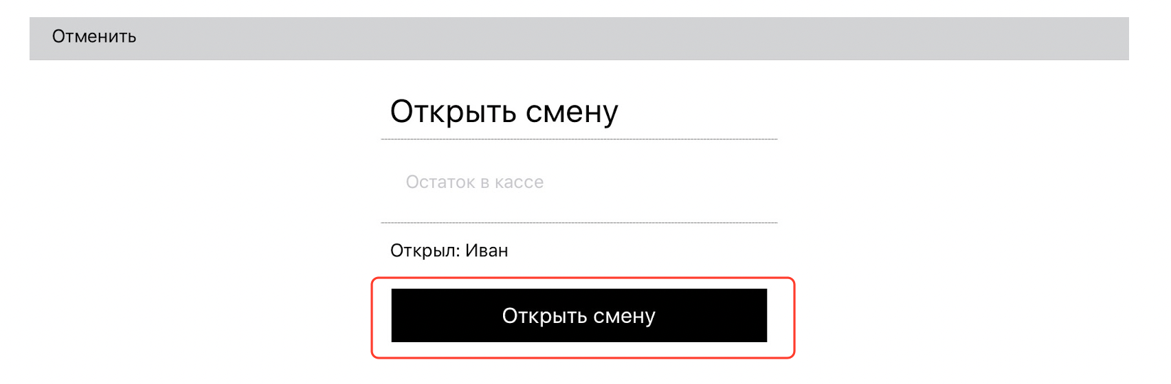 Если пин-код введен верно, вы увидите форму открытия смены официанта, если она еще не открыта для текущего дня, либо свой аккаунт. Смену открывает первый авторизующийся официант. Форма показывает имя официанта, открывающего смену, и предлагает указать текущий остаток в кассе: