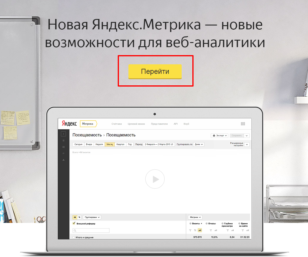 Чтобы создать счётчик, перейдите по ссылке https://metrika.yandex.ru/ и нажмите на кнопку «Перейти». Войдите в личный кабинет любым удобным для вас способом.