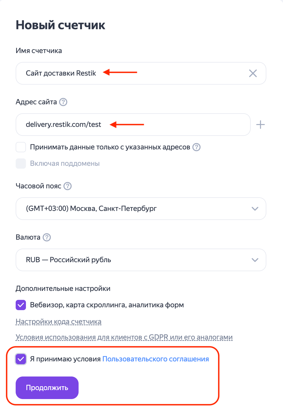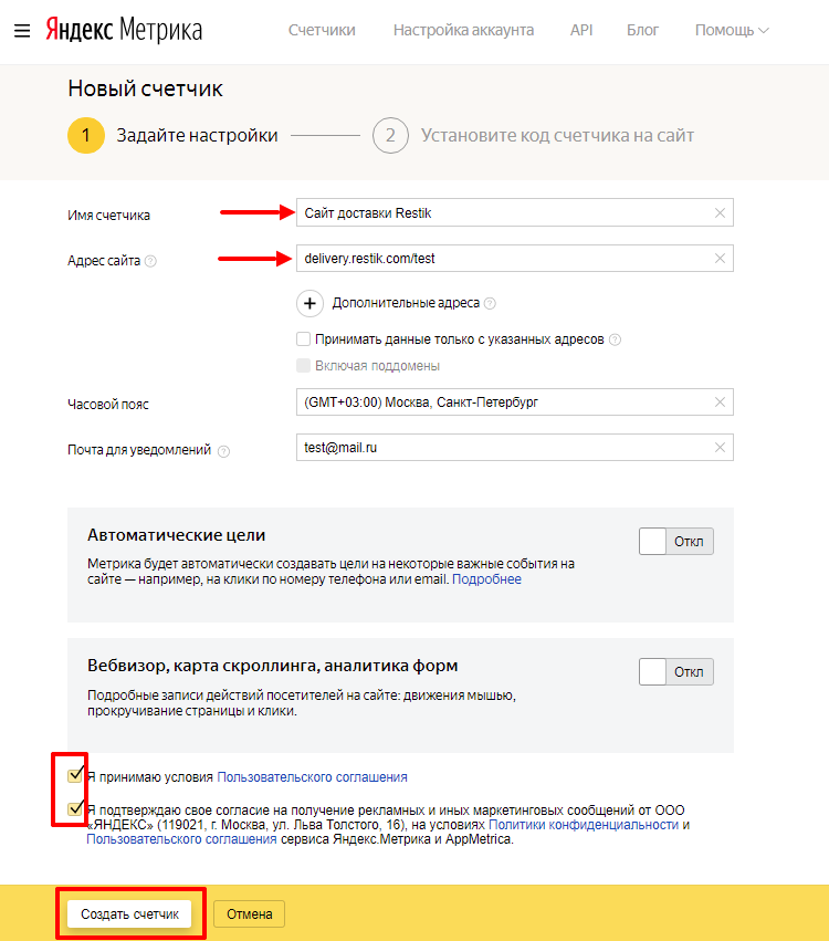 Имя счётчика — будет показываться только в списке счётчиков. Можно назвать, например: «Сайт доставки Restik»;
