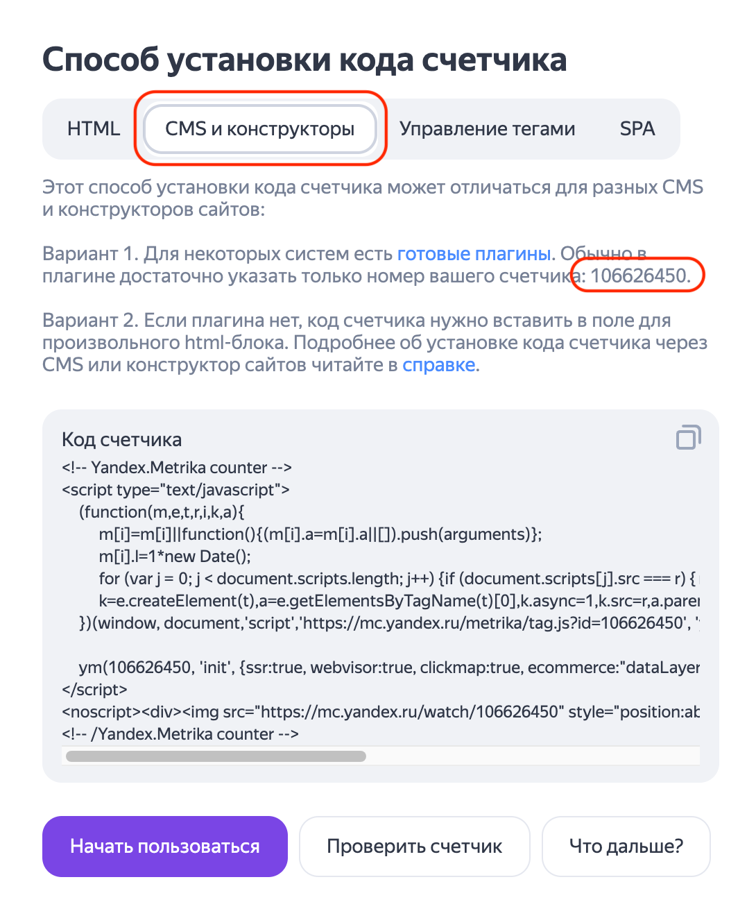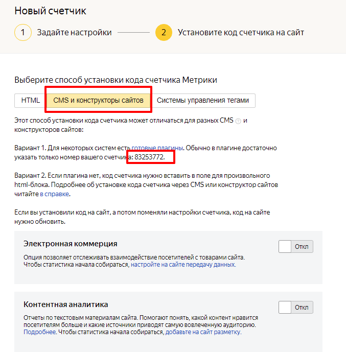 Нажмите «Создать счетчик». На следующем шаге выберите пункт «CMS и конструкторы сайтов» — Яндекс.Метрика покажет вам номер счётчика.