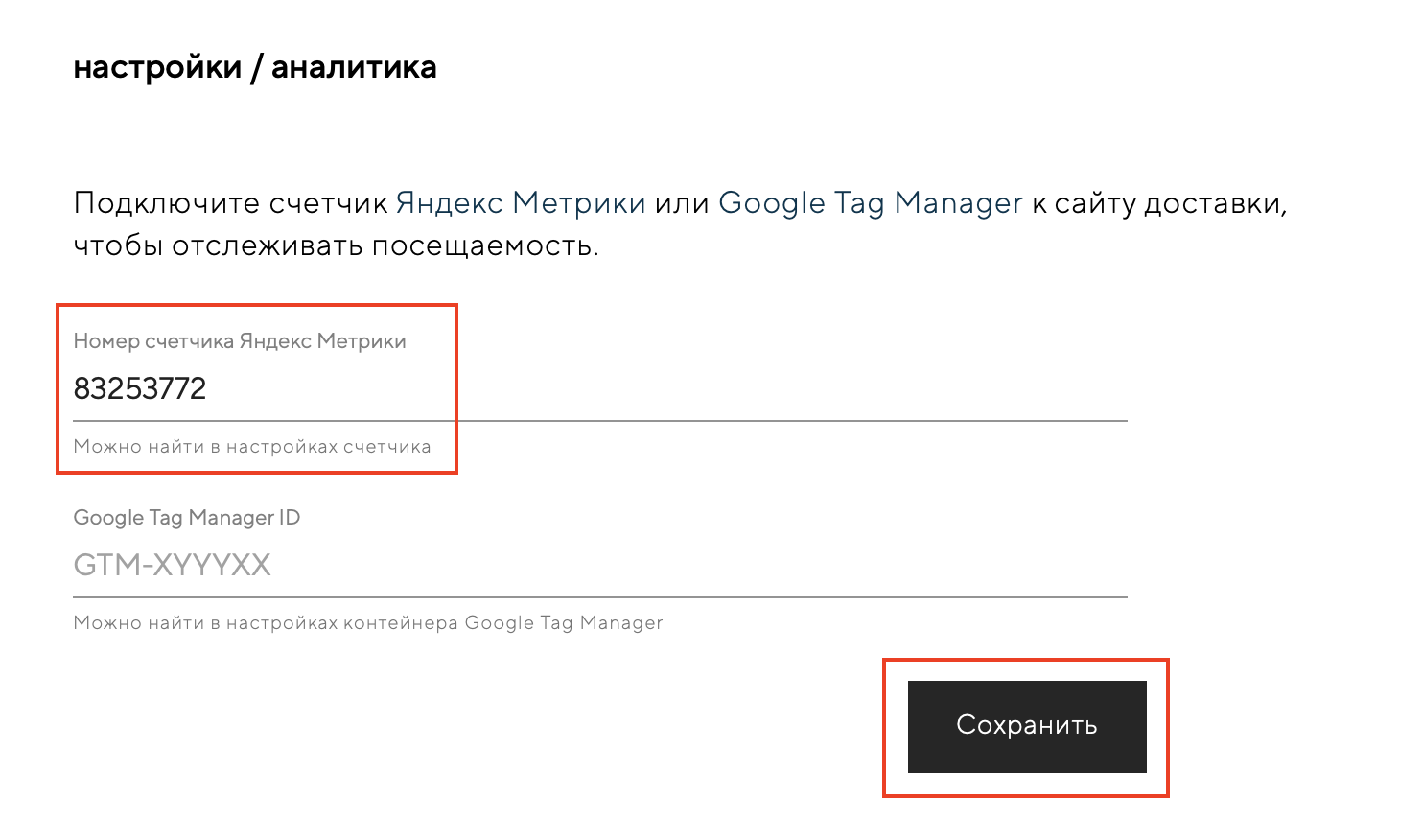 Скопируйте его, затем зайдите в админку сайта доставки, в раздел «Настройки» — «Аналитика» и введите номер в поле «Номер счетчика Яндекс.Метрики».