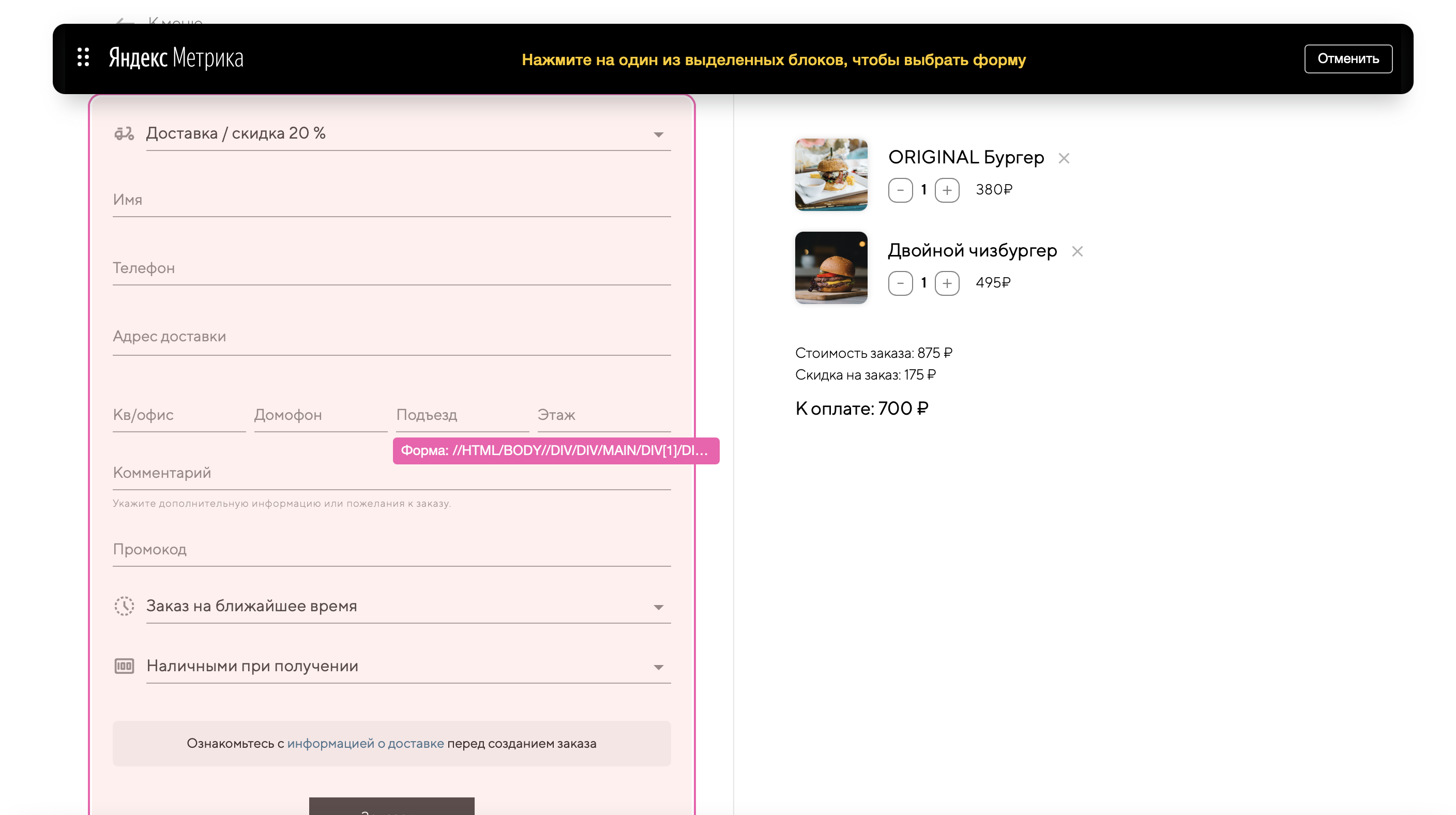 В появившемся окне Метрика подсветит формы, которые удалось определить на странице. Выберите форму заказа.