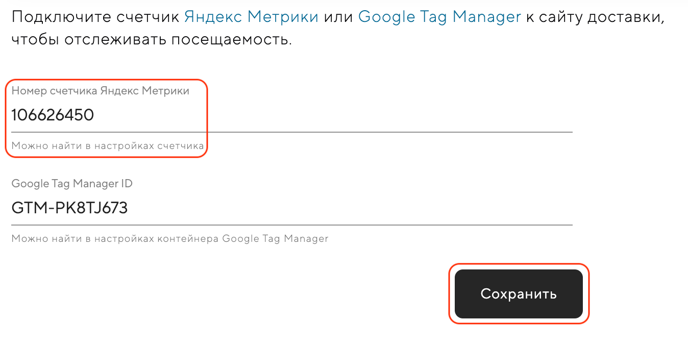 Зайдите в админку сайта доставки, в раздел «Настройки» — «Аналитика» и введите скопированный номер в поле «Номер счетчика Яндекс.Метрики». Нажмите кнопку «Сохранить».