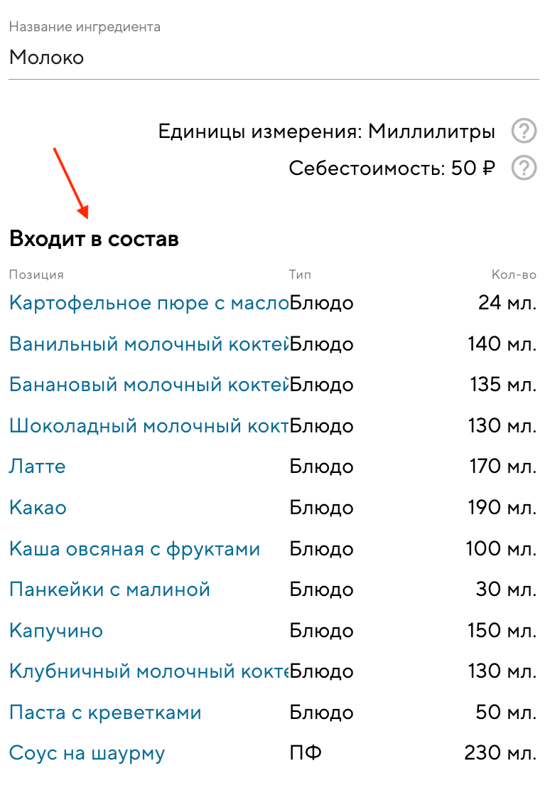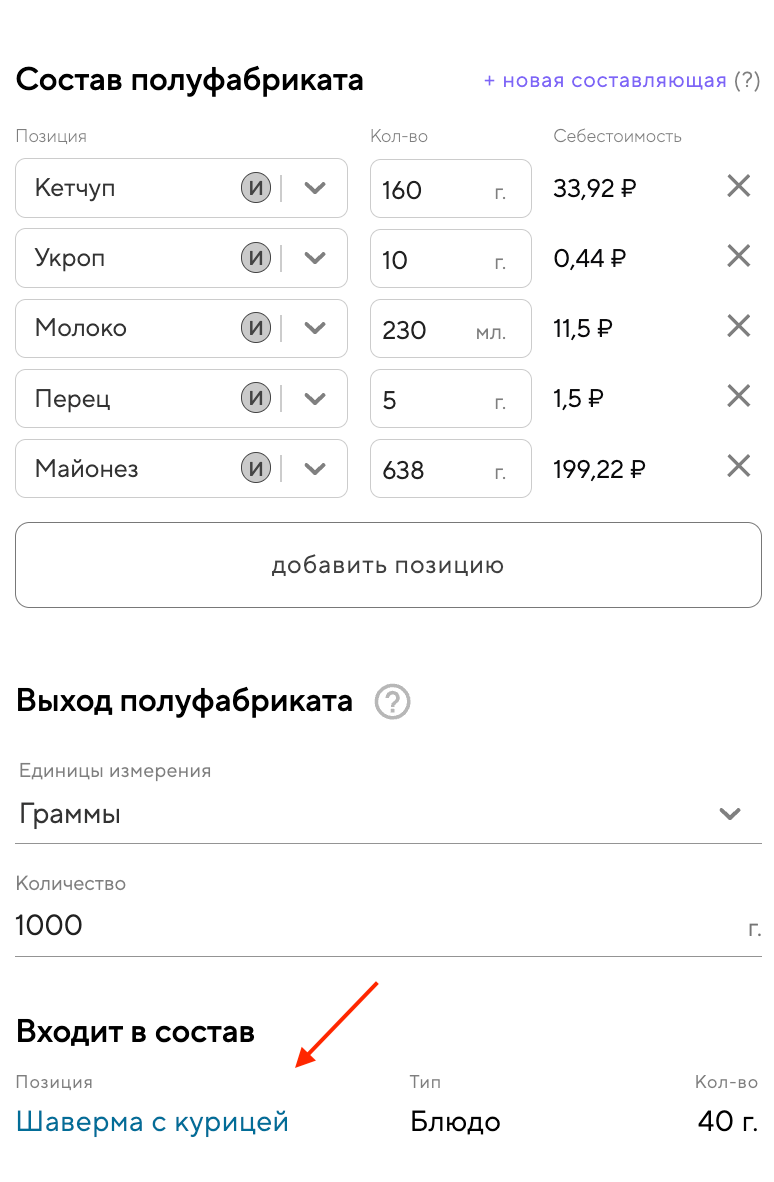 Вы можете увидеть, в какие типы позиций входят ингредиенты или полуфабрикаты и в каком количестве. Если нажать на название позиции, вы перейдёте в карточку этой позиции.