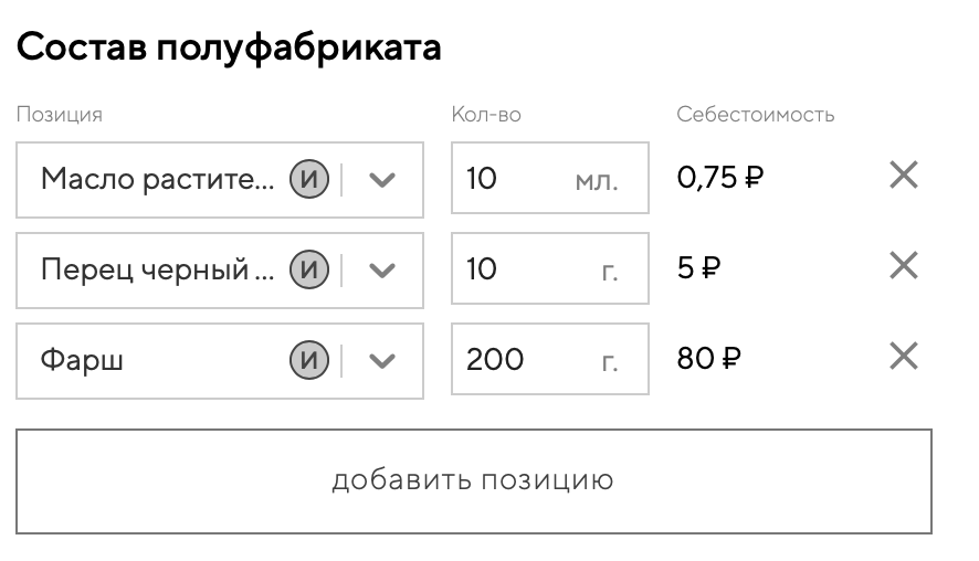 Себестоимость полуфабриката будет рассчитана автоматически в зависимости от метода списания. Подробнее о себестоимости можно прочитать здесь.
