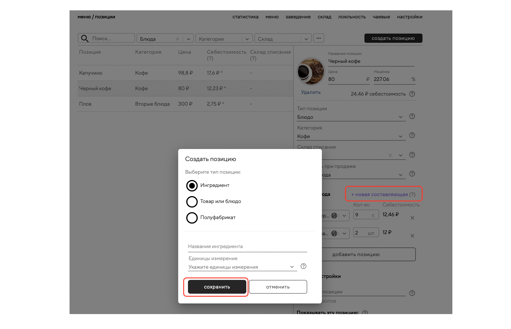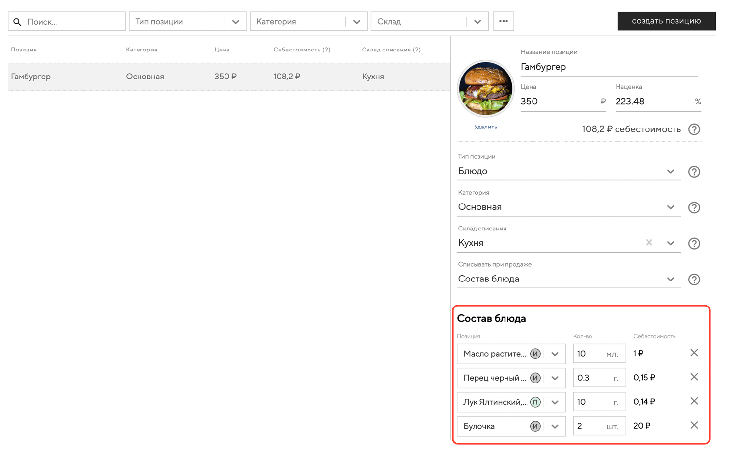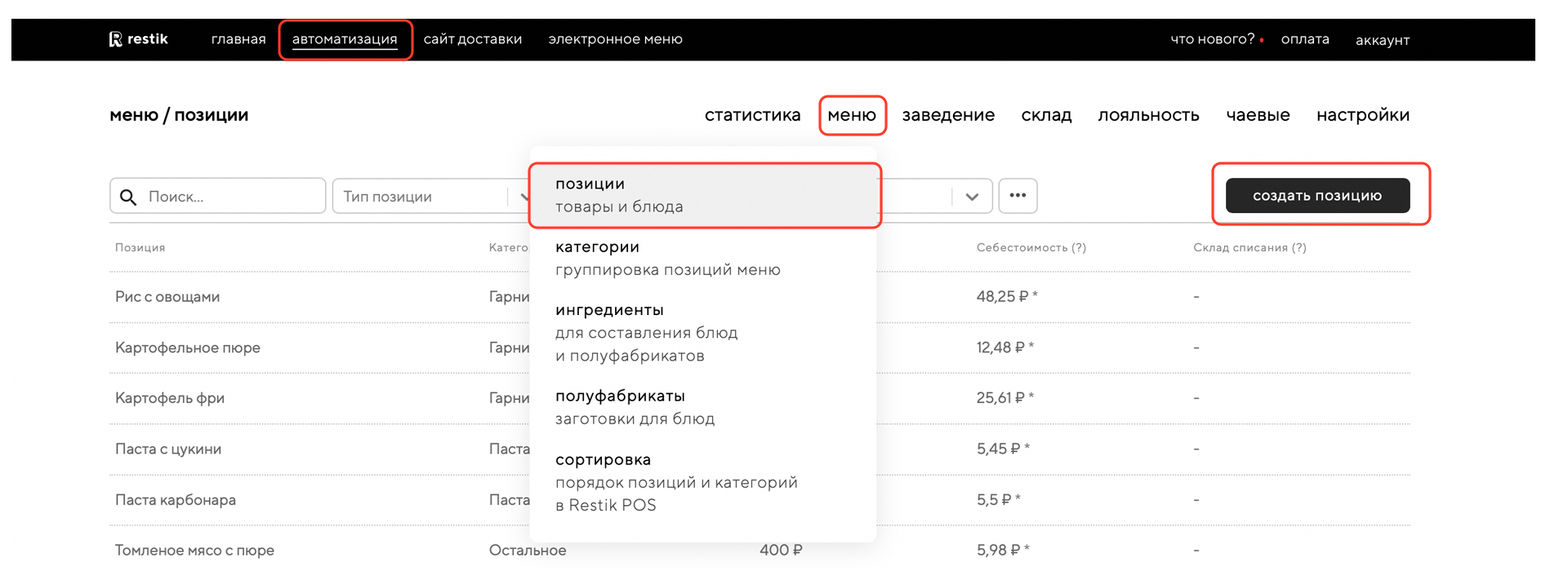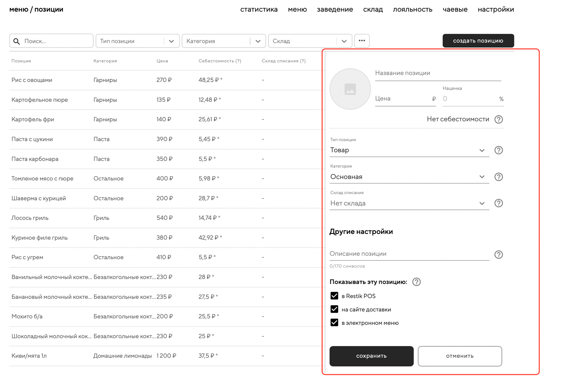 В Restik вы можете создавать 4 вида позиций — товары, блюда, ингредиенты и полуфабрикаты.