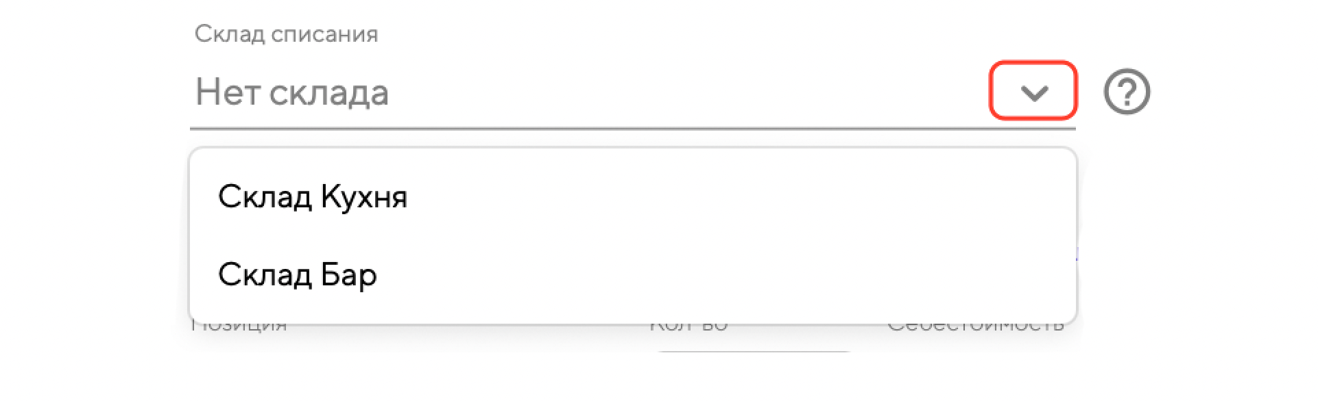 💡Если склад списания не указан, товары и ингредиенты не будут списываться ни с одного склада. Не разделяйте склады по категориям — разные склады нужны для раздельного учёта. Например, у вас физически есть разные склады и одна и та же позиция может находиться на разных складах с разной себестоимостью. Разные склады в этом случае вызывают усложнение учета и затрудняют работу.
