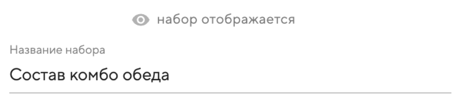 Укажите название набора. Например «Состав комбо обеда». Название набора будет отображаться официантам в приложении Restik POS, а также гостям на сайте доставки и в электронном меню. Вы можете нажать «набор отображается» и выбрать для каких продуктов будет доступен этот набор, подробнее по ссылке.