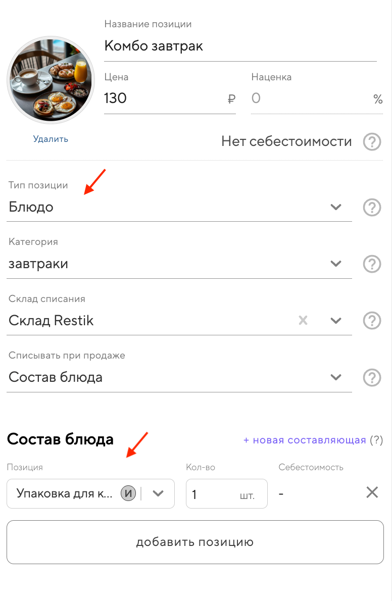 Например, если вы создаёте «Комбо-завтрак» и добавляете в состав расходные материалы (коробки, пакеты и т.д.), нужно создать блюдо с составом. Если расходных материалов нет, можно создать товар «Комбо-завтрак».