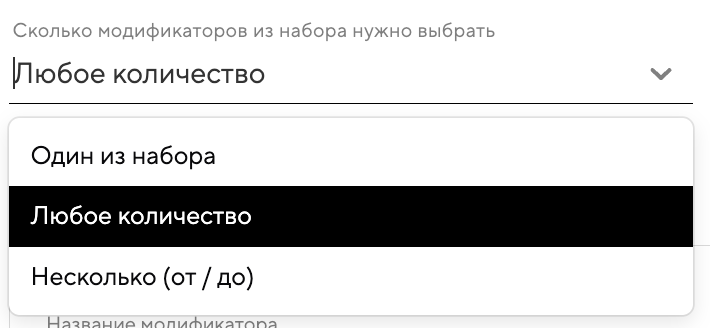 Несколько (от/до): обязательно выбрать нужное количество модификаторов. Например: не меньше одного, или не больше двух, или от двух до трех.