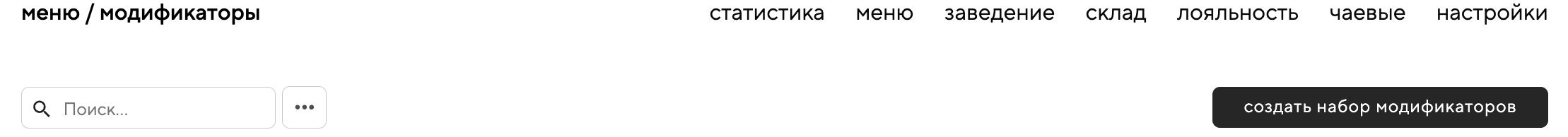 Чтобы создать набор модификаторов перейдите в раздел «меню» — «модификаторы» соответствующего продукта и нажмите «создать набор модификаторов»:
