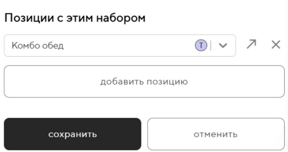 Для позиции можно создать набор модификаторов, который позволит выбрать состав комбо-набора. Подробнее про модификаторы можно прочитать в статье.