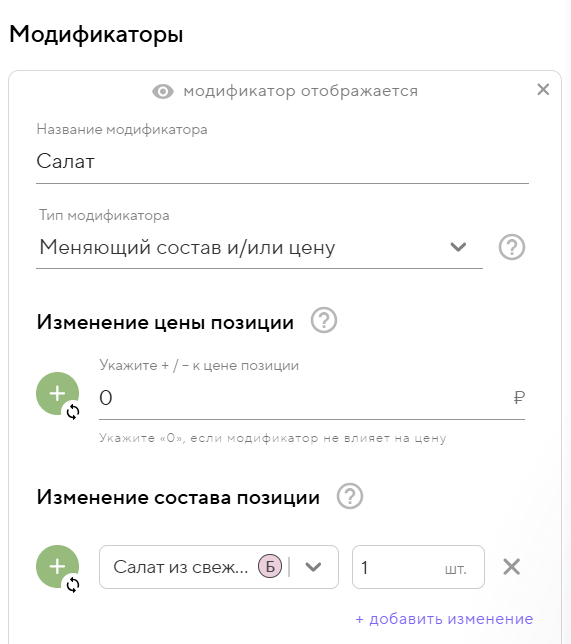 Создайте модификаторы в наборе. Укажите их названия, влияние на стоимость и состав, а также настройте выбор по умолчанию.