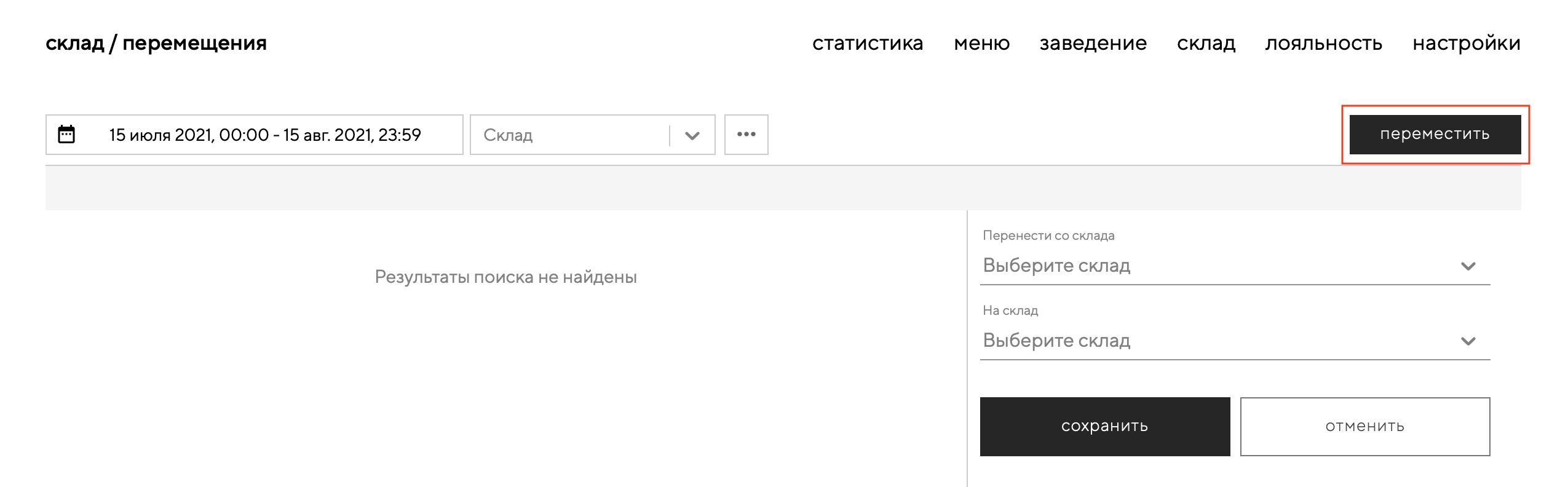 Для того, чтобы перенести позиции, перейдите в раздел «склад» — «перемещения», нажмите на кнопку «переместить» и заполните информацию.