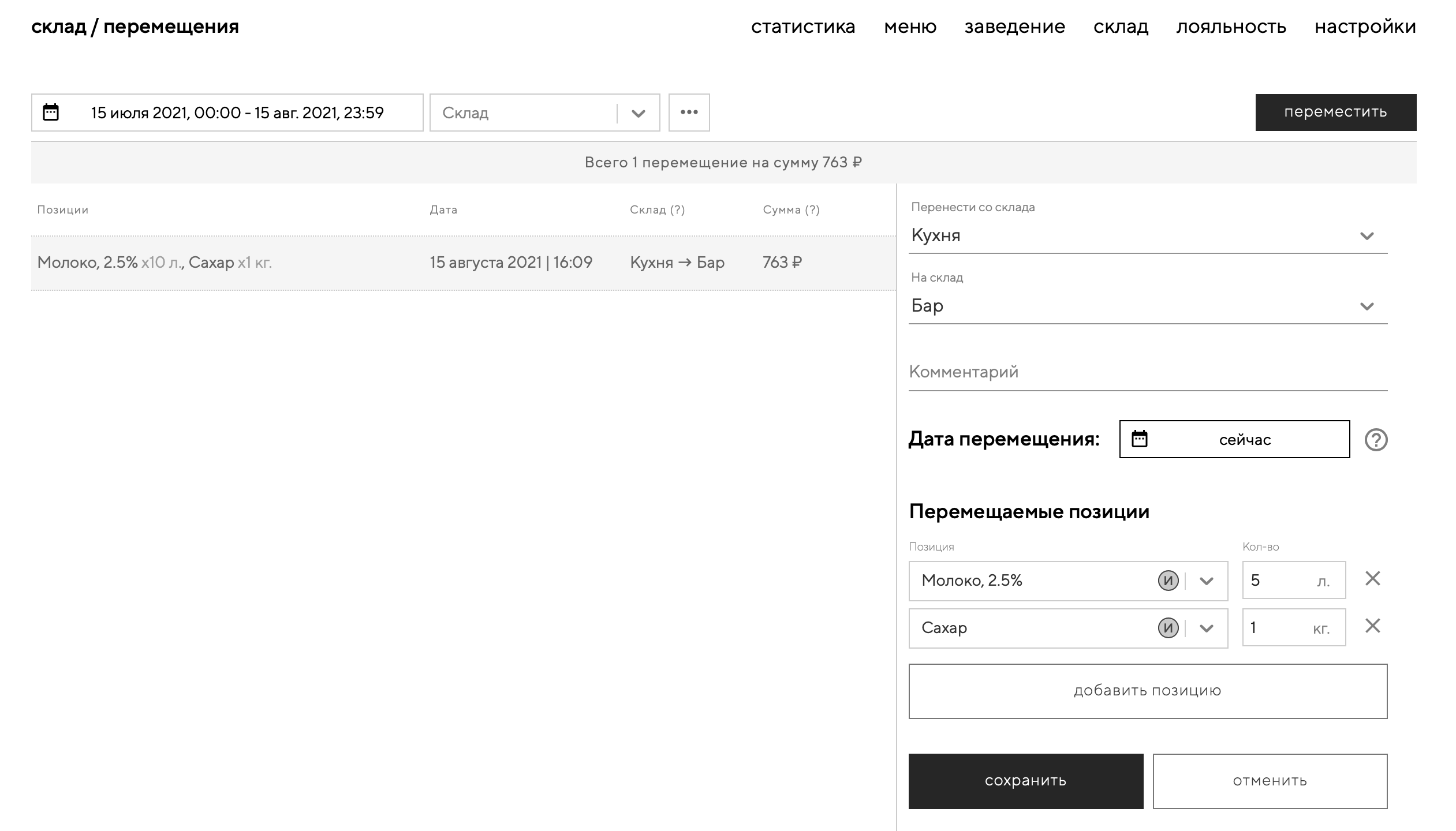 Если позицию необходимо перенести с одного склада на другой, можно воспользоваться операцией перемещения. При перемещениях сохранится себестоимость позиции.
