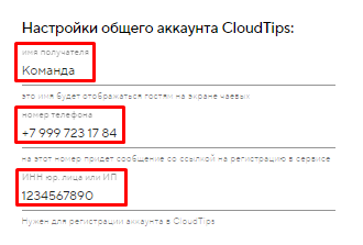 настоящий номер телефона получателя — на него будет выслана SMS со ссылкой на настройку личного аккаунта CloudTips;