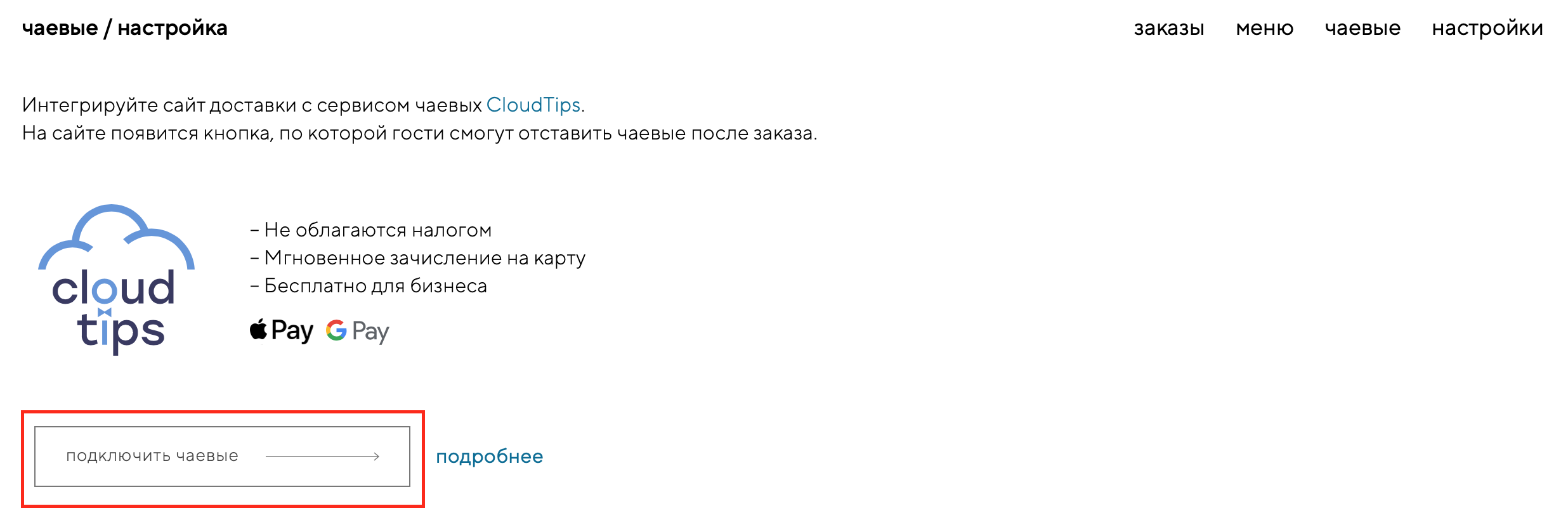 Перед подключением чаевых ознакомьтесь с условиями сервиса CloudTips на официальном сайте.