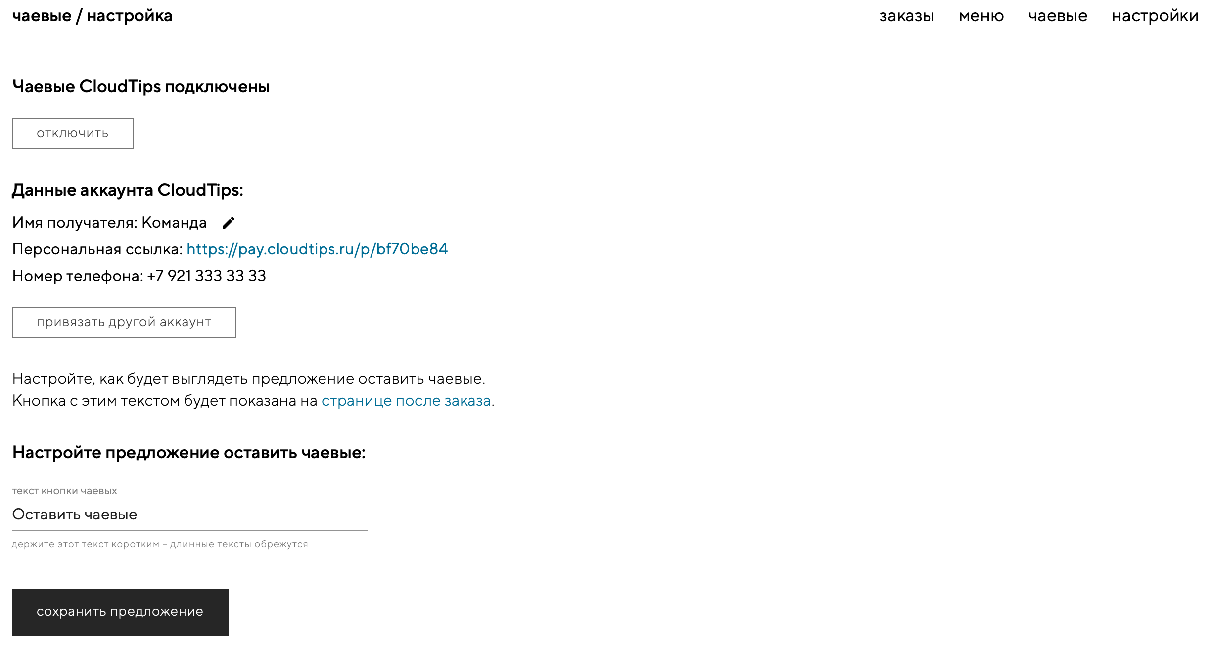 Отлично, чаевые настроены. Вы сможете в любой момент поменять предложение оставить чаевые на странице «чаевые» — «настройка». Здесь же вы сможете отключить сервис чаевых, поменять имя получателя и привязать другой аккаунт CloudTips:
