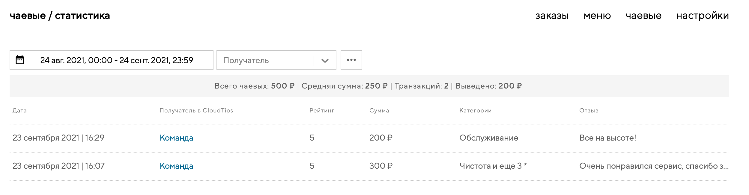 Статистика по чаевым — средняя сумма, количество транзакций и др.