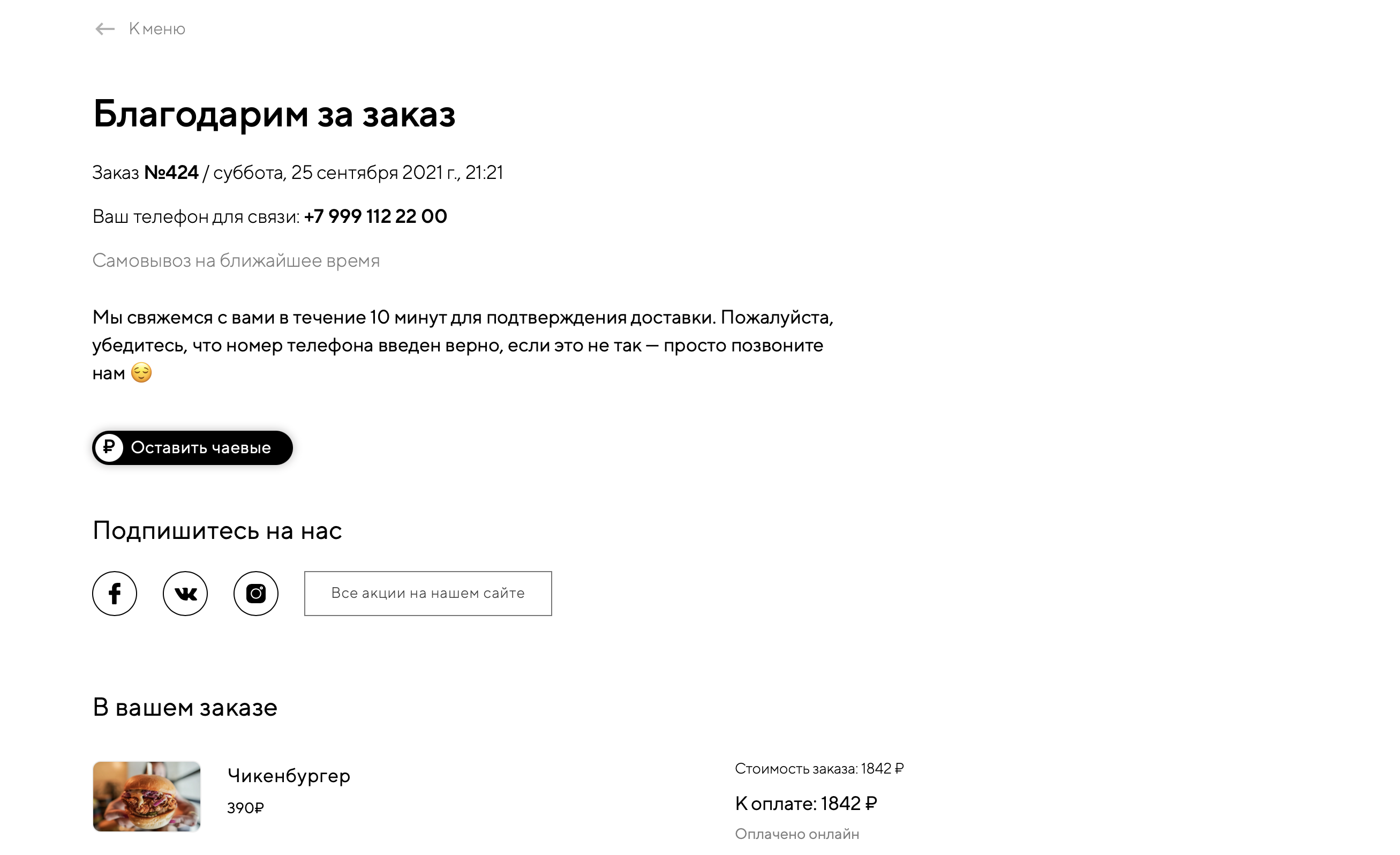 Настройка предложения оставить чаевые и его отображение в кнопке на странице после заказа на сайте доставки.