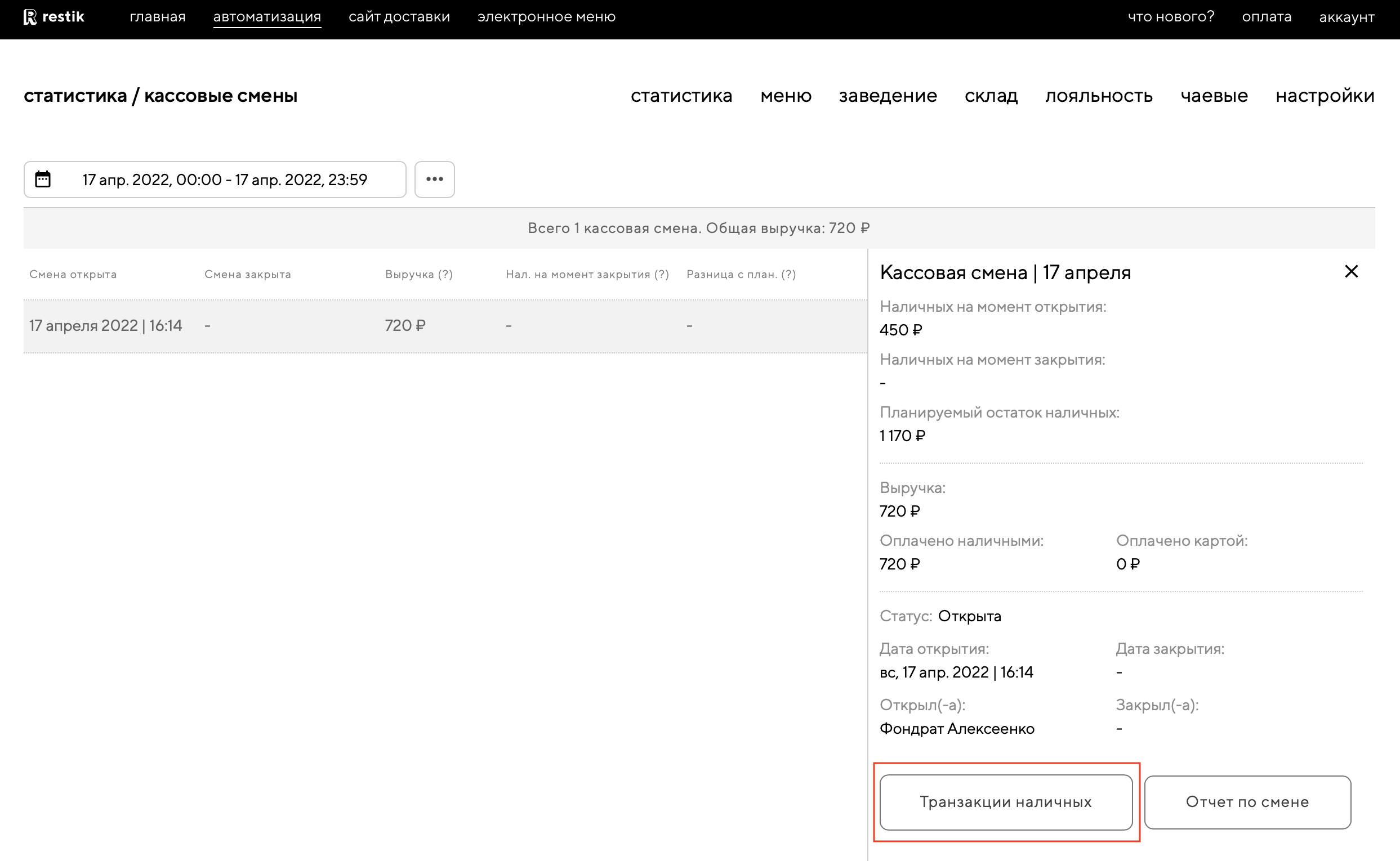 Например, кассовая смена от 17 апреля: