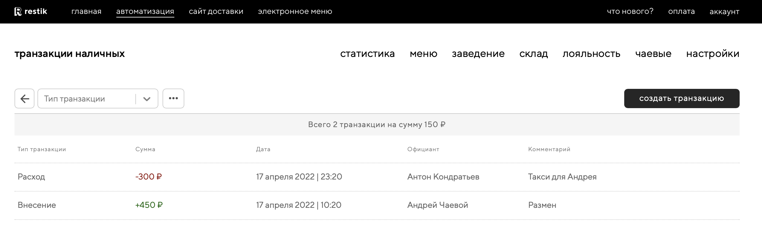 Транзакцию можно провести как в веб-версии панели администратора, так и в приложении для официантов Restik POS. О работе с транзакциями в приложении для официантов, читайте в этой статье.