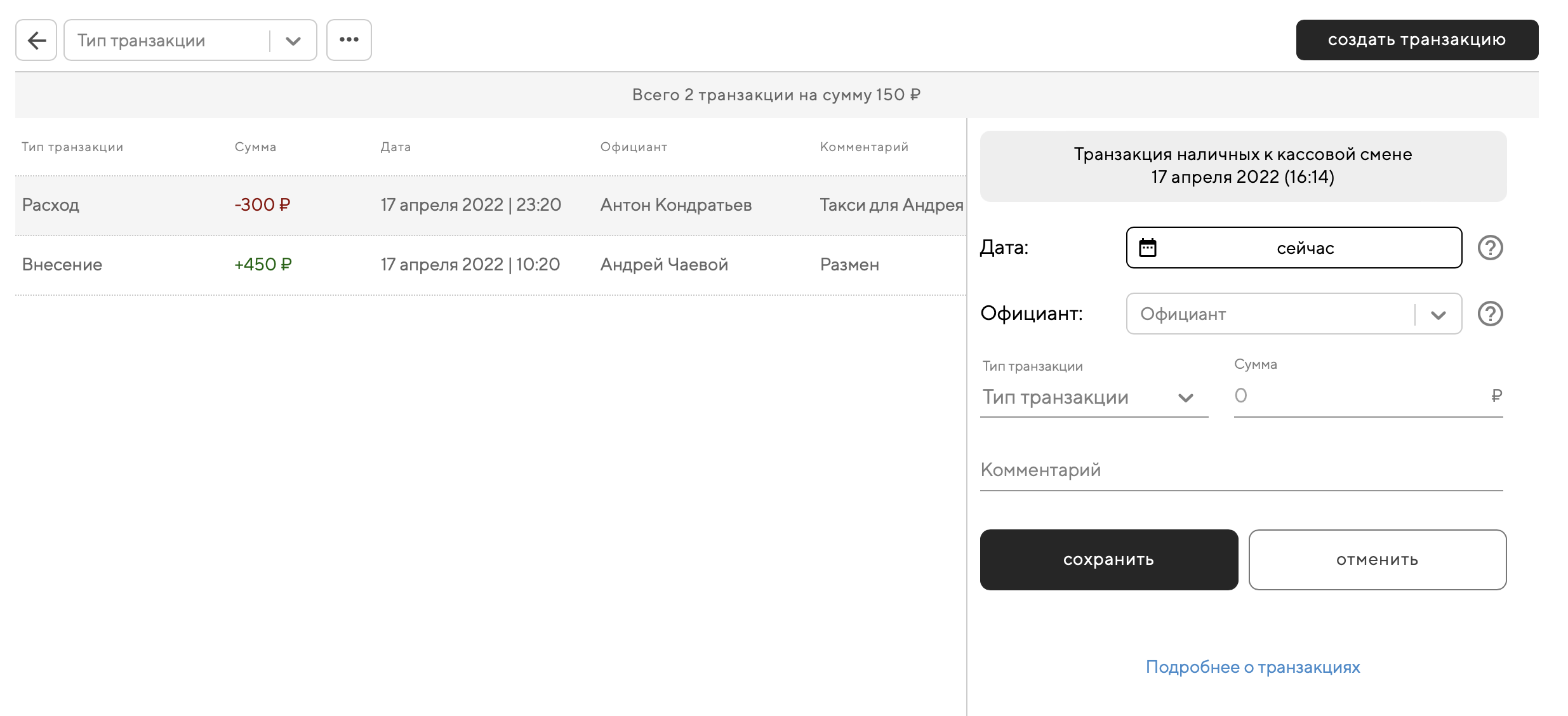 Транзакции наличных позволяют фиксировать расходы, делать внесения и инкассации в течение кассовой смены — это нужно для учёта наличных и правильного расчёта планируемого остатка наличных в кассе.