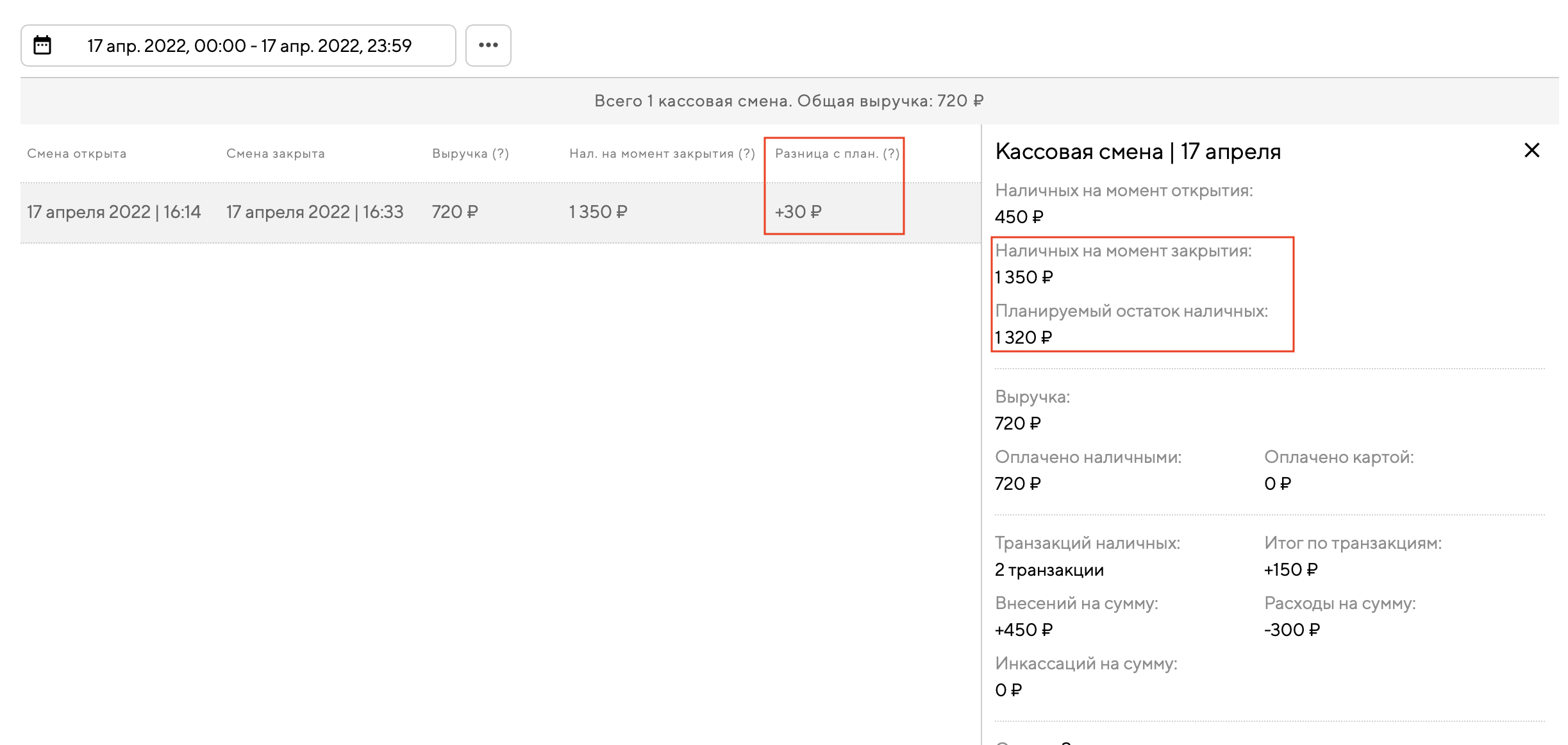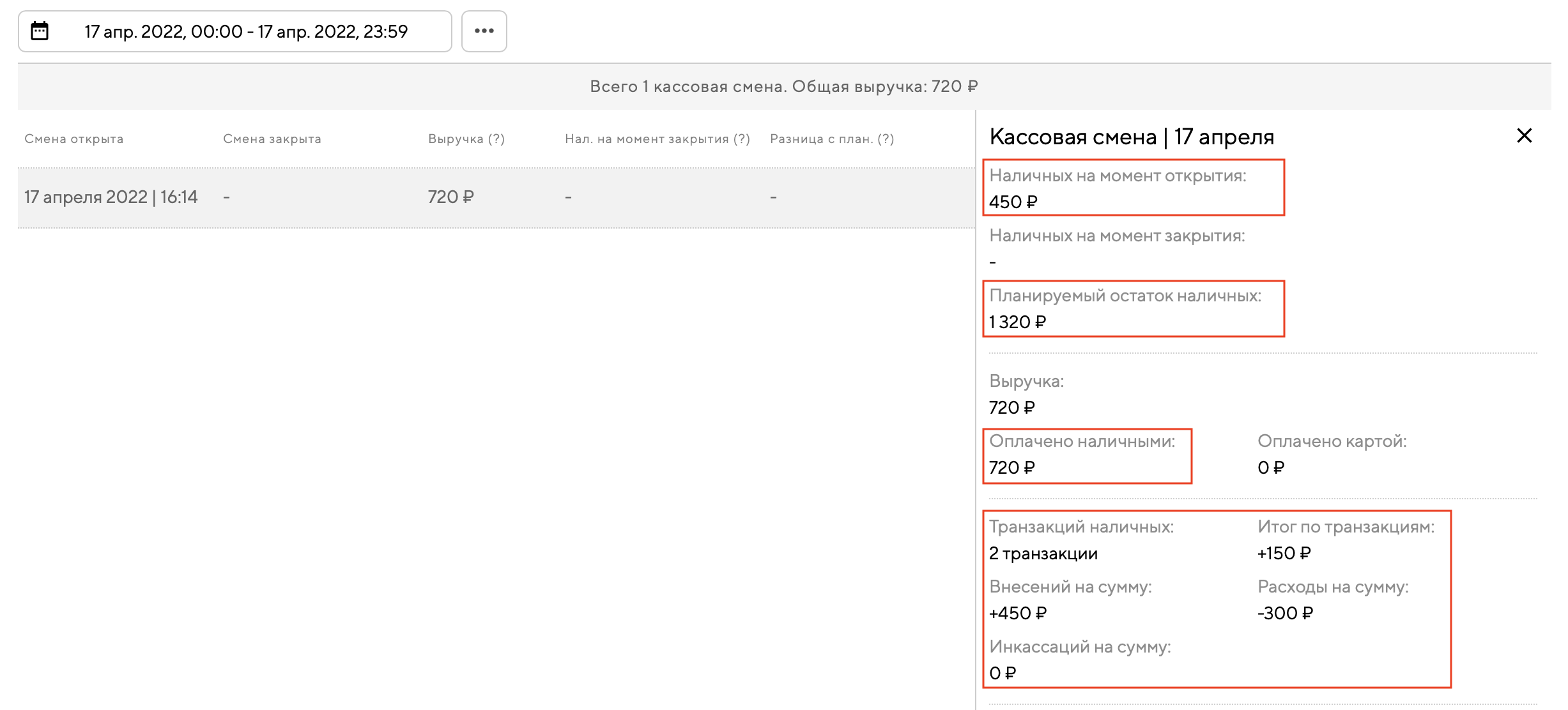 После проведения транзакции наличных для кассовой смены автоматически пересчитается «планируемый остаток наличных в кассе». Информацию об этом можно посмотреть на странице кассовых смен.