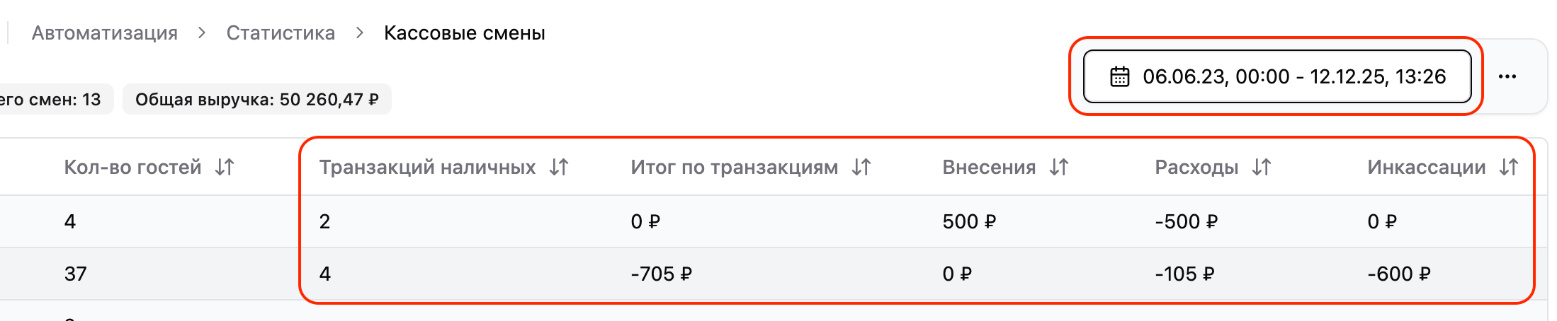 Чтобы просмотреть историю транзакций средств за определённый период, откройте раздел «Статистика — Кассовые смены» в панели администратора. С помощью фильтра по датам выберите нужный период (например, месяц). В каждой смене вы можете увидеть все транзакции.