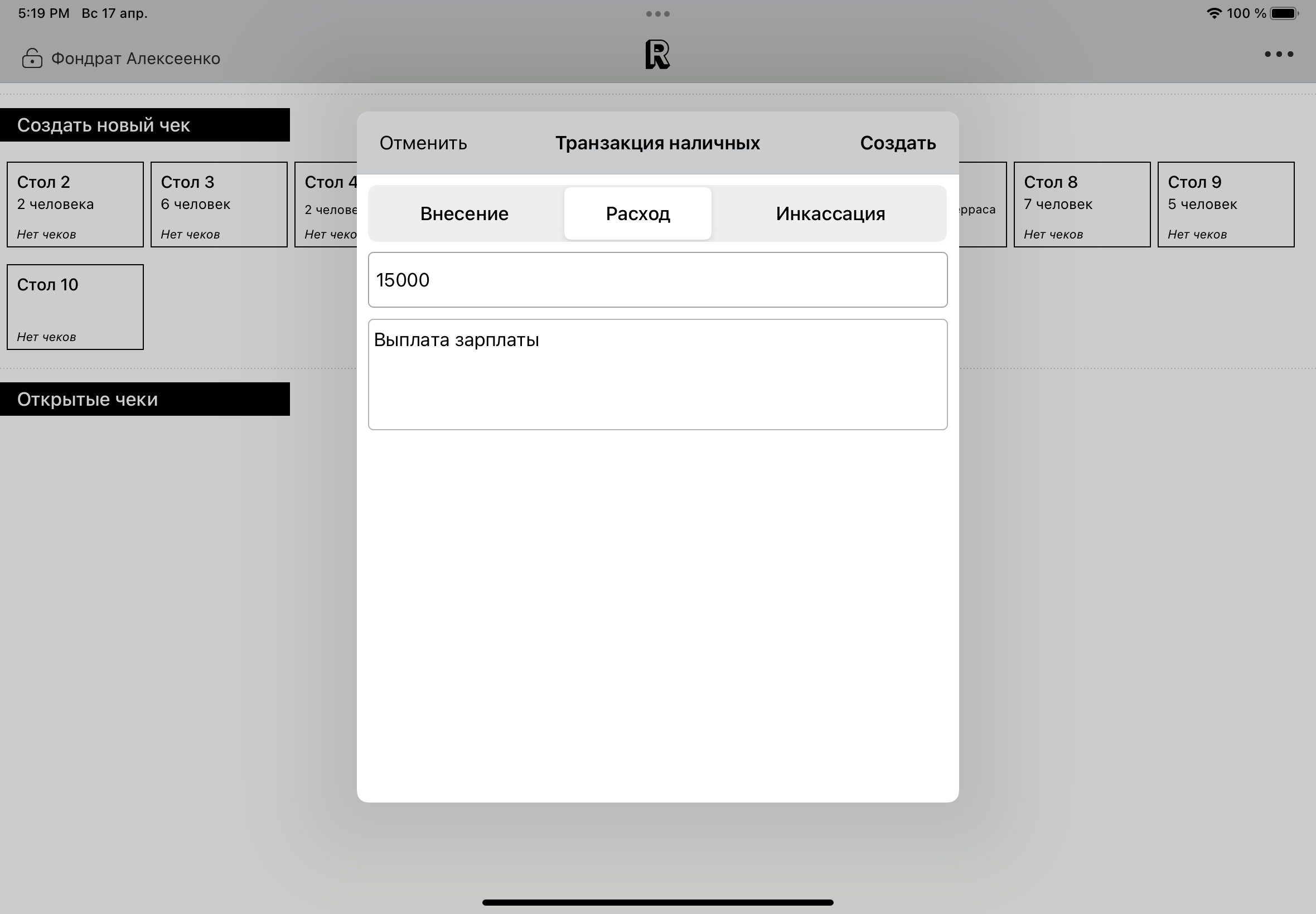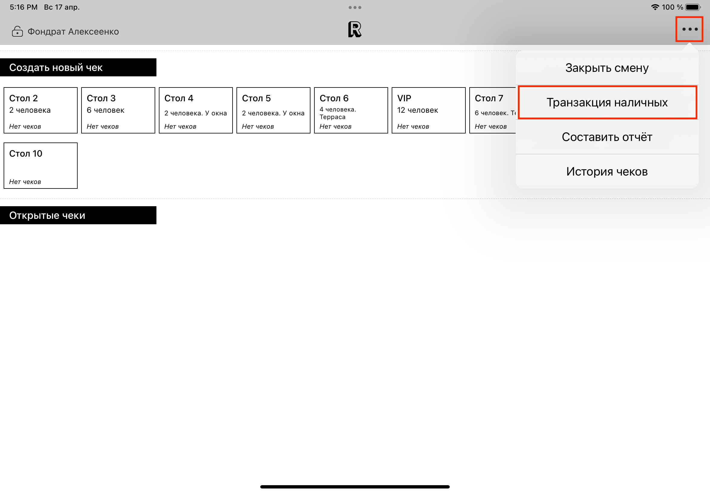 Чтобы создать транзакцию наличных в приложении Restik POS, нажмите на кнопку с тремя точками в правом верхнем углу главного экрана и выберите пункт «Транзакция наличных»: