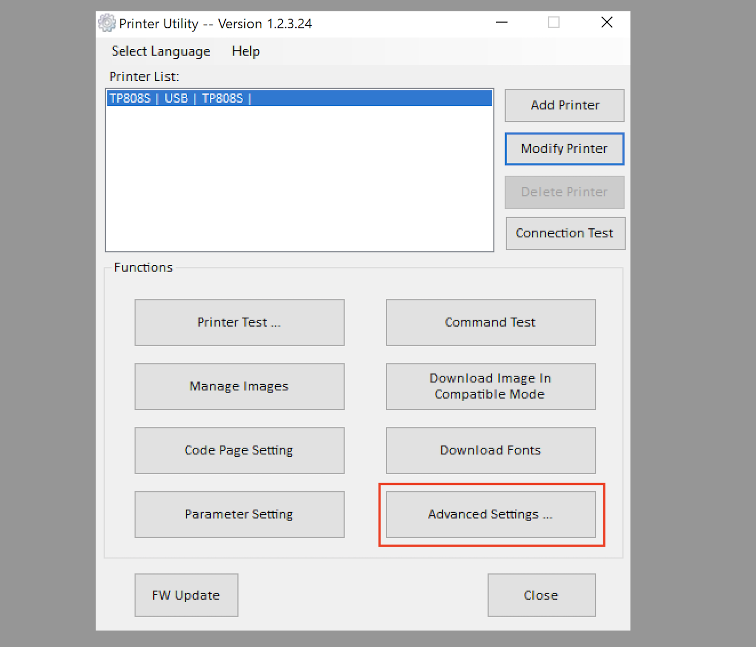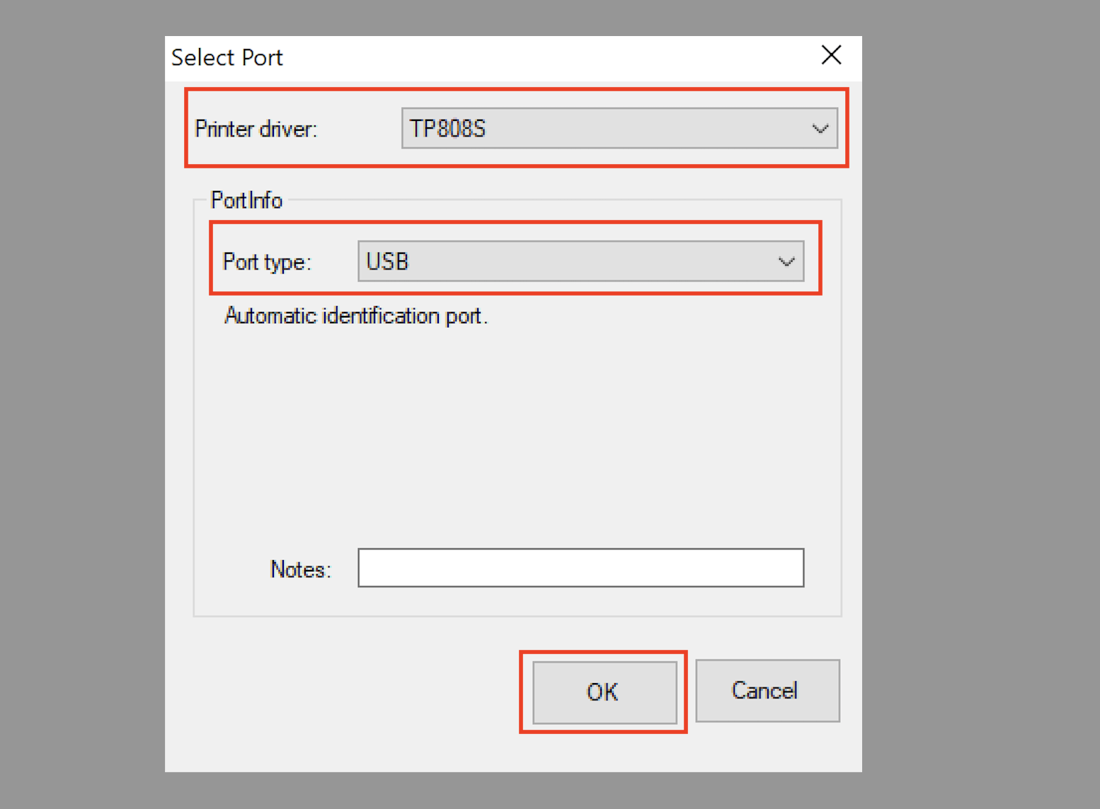 Выберите Printer driver: TP808S, Port type: USB и нажмите на кнопку OK: