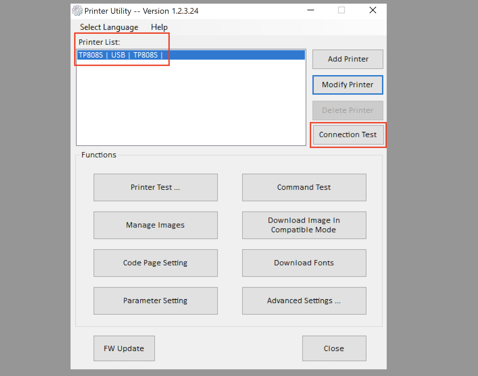 В списке устройств появится добавленный принтер, выделите его и нажмите на кнопку «Connection Test»: