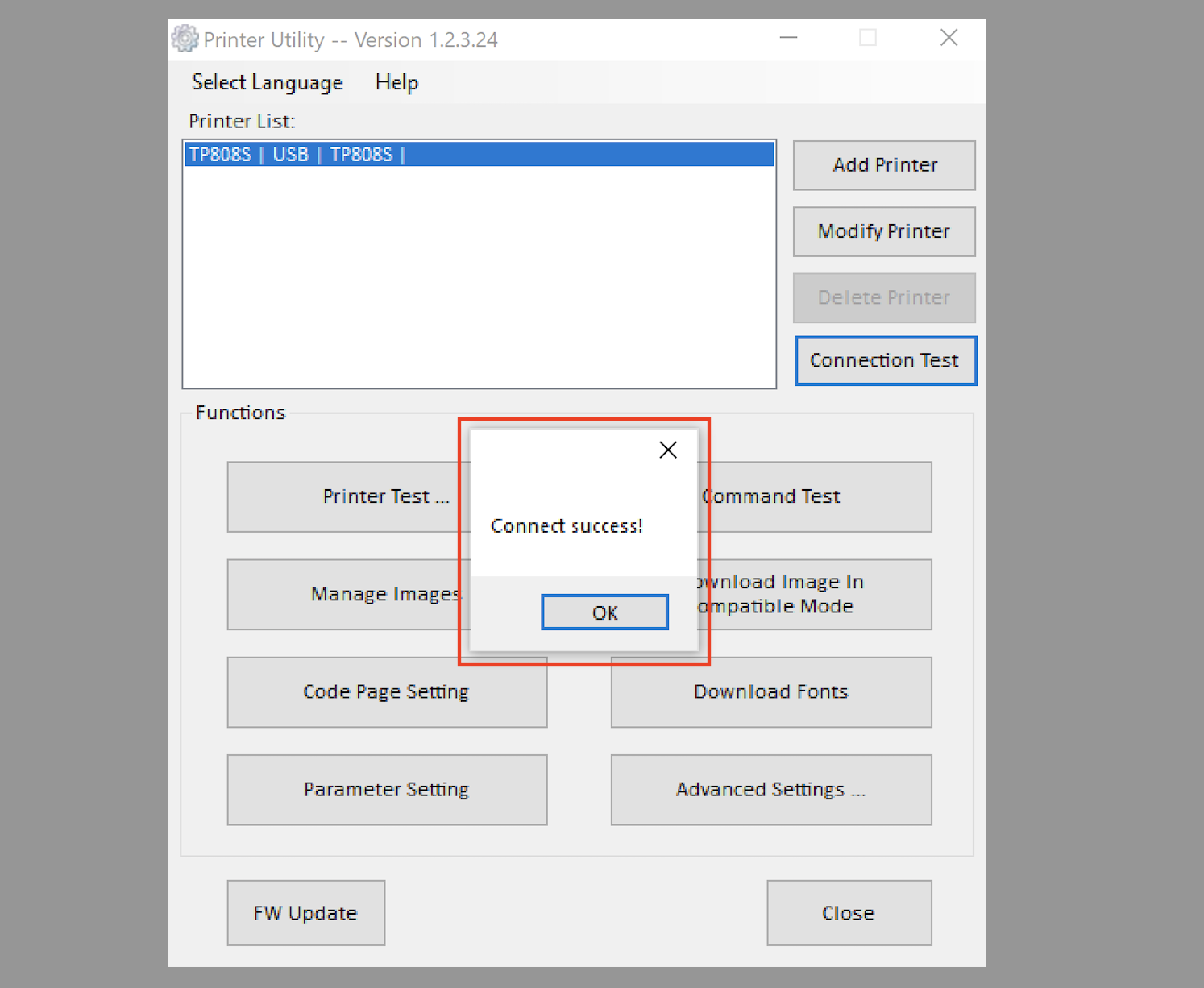 Если принтер включен в сеть и подключен к компьютеру по USB — появится сообщение об успешном тестировании соединения «Connect success».