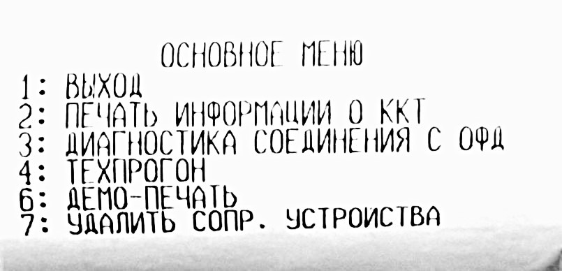 Для этого включите кассу, одновременно нажимая и удерживая кнопку промотки чековой ленты. Устройство воспроизведет звук включения, затем следующий звуковой сигнал, после которого нужно отпустить кнопку промотки чековой ленты. В сервисном режиме устройство распечатает документ «Основное меню»: