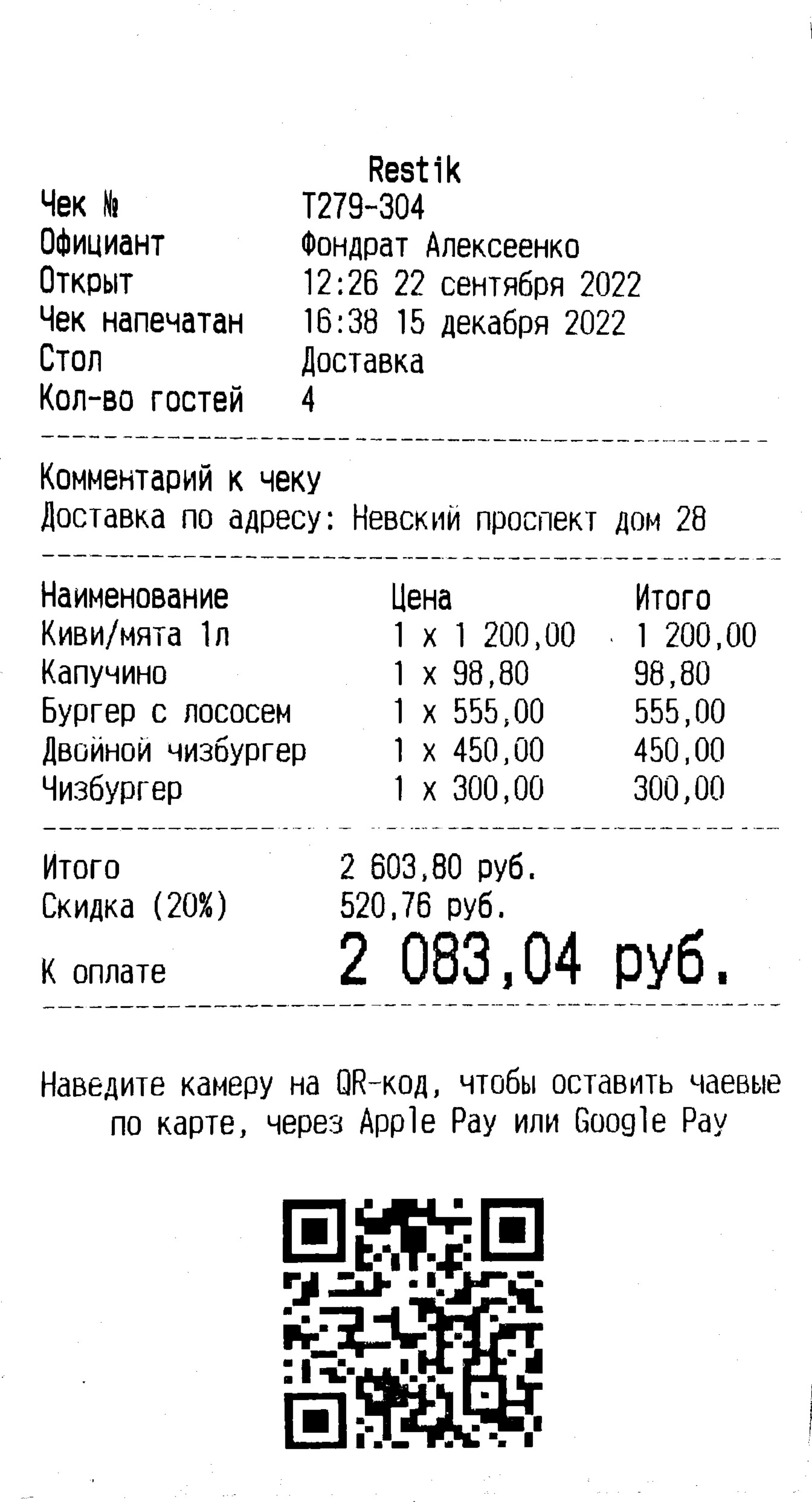 В фискальном чеке применение гостя не отображается, но если была скидка или оплата бонусами, это будет указано. Также на фискальном чеке нельзя распечатать QR-код для чаевых, так как всегда печатается QR-код налоговой по правилам.