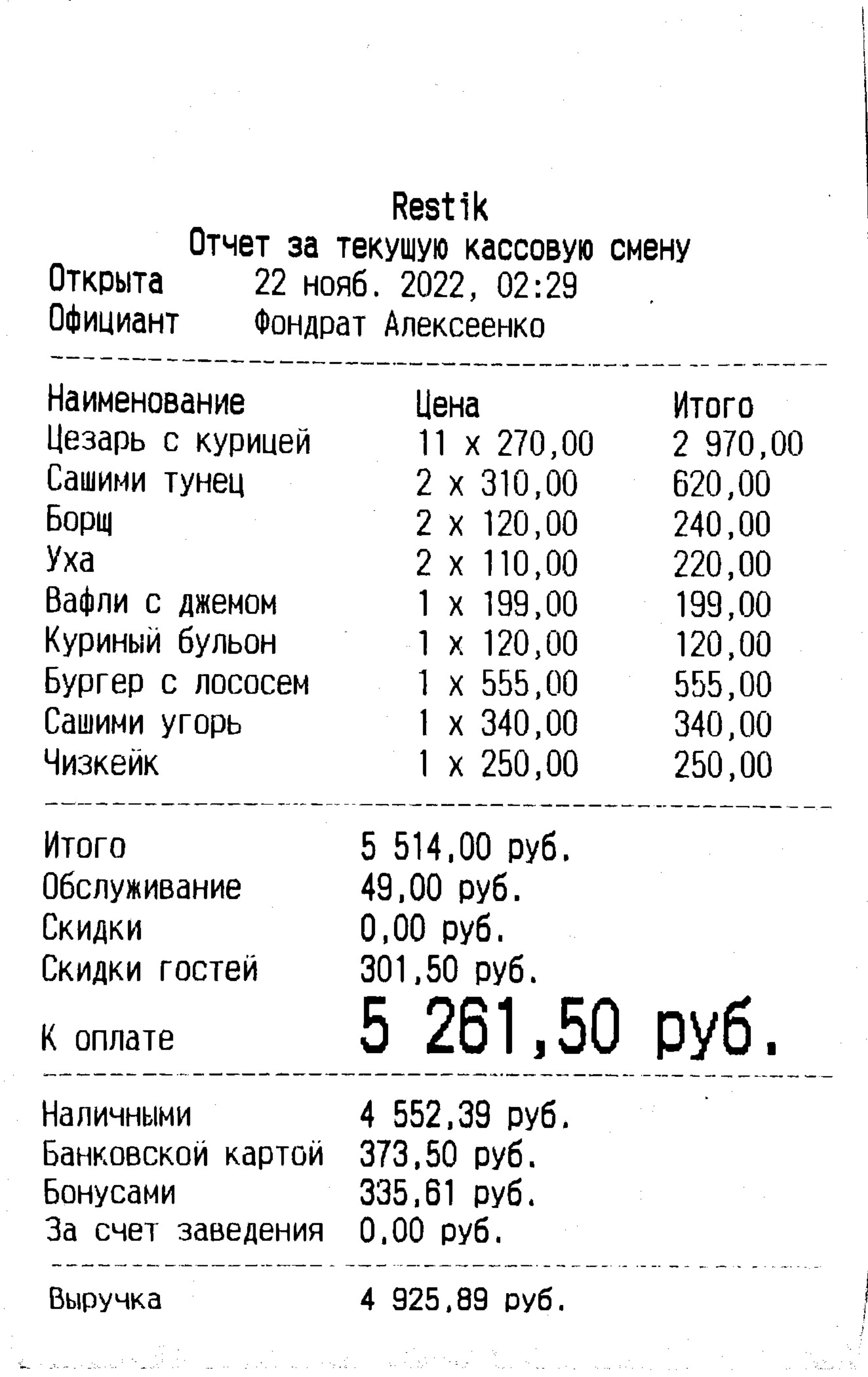 В отчёте отображаются: имя официанта, дата и время открытия кассовой смены, проданные позиции за смену, с их количеством и ценой, итоговая сумма за смену, фиксированные скидки и скидки гостей за смену, процент за обслуживание за смену (если он был применен), сумма к оплате за смену, итог по типу оплаты (наличные, оплата за счёт заведения, бонусы или безнал) за смену, выручка за смену.