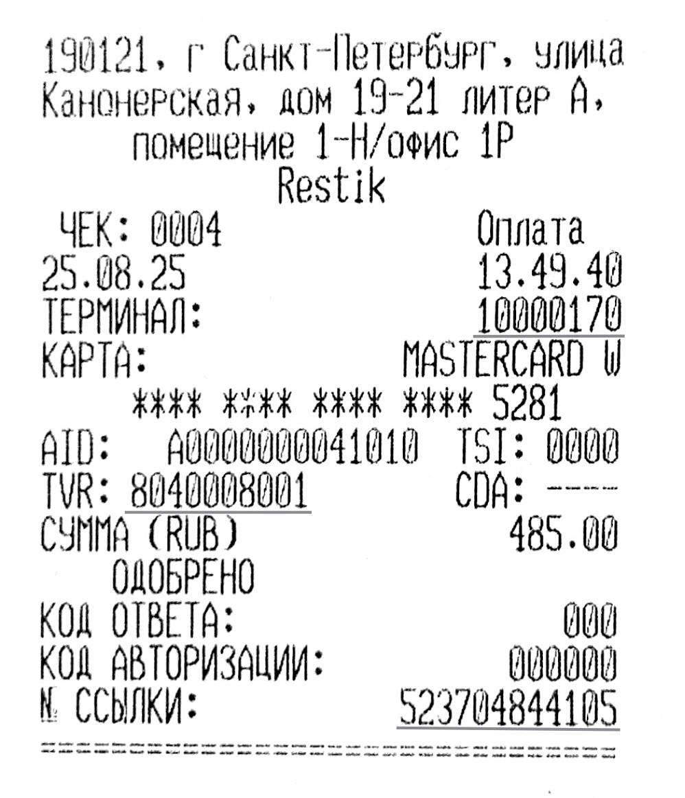 В слипе отображаются адрес заведения, номер чека, дата пробития, сумма оплаты и другие данные банковской транзакции.