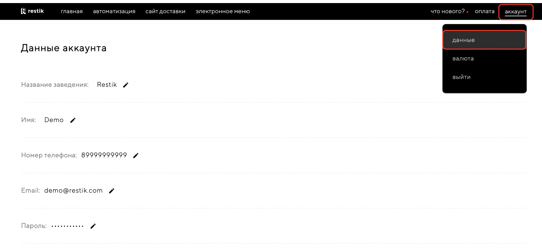 Используется для входа в аккаунт. Чтобы задать новый пароль от вашего аккаунта в Restik, кликните на иконку маркера и измените данные: