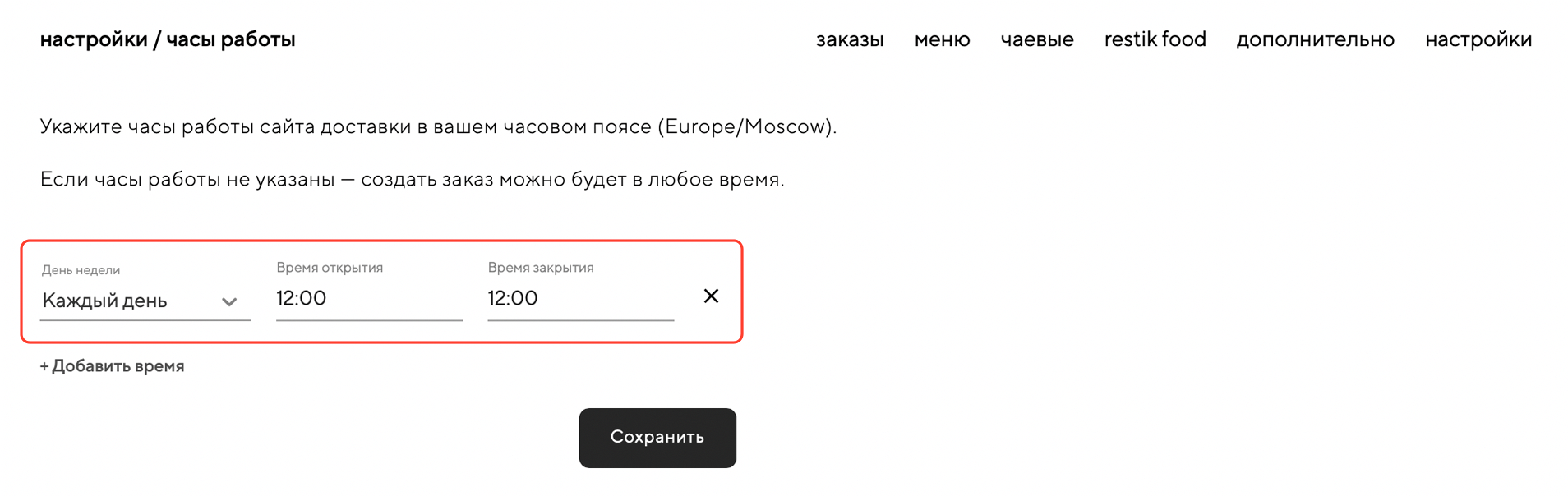 Чтобы ограничить время приема заказов, перейдите в панель администратора сайта доставки, в раздел «настройки» — «часы работы»: