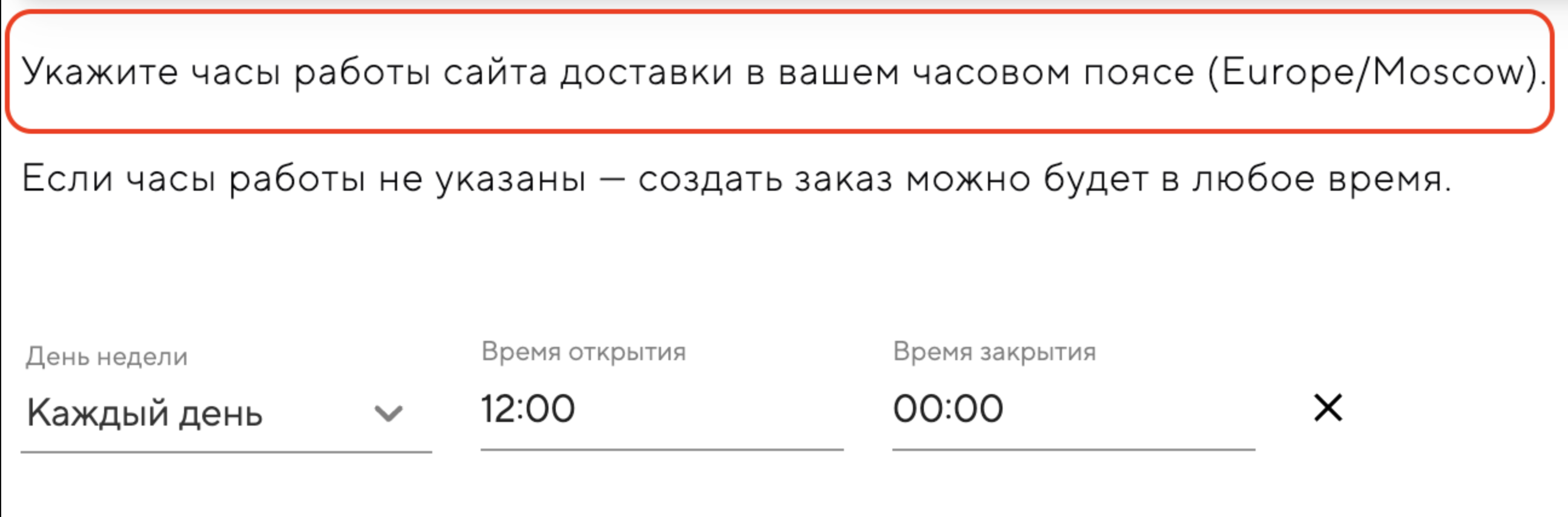 Укажите часы работы сайта доставки в вашем часовом поясе. Часовой пояс на сайте доставки устанавливается один раз при первой настройке часов работы. Таймзона определяется по устройству, с которого выполнялась эта настройка.