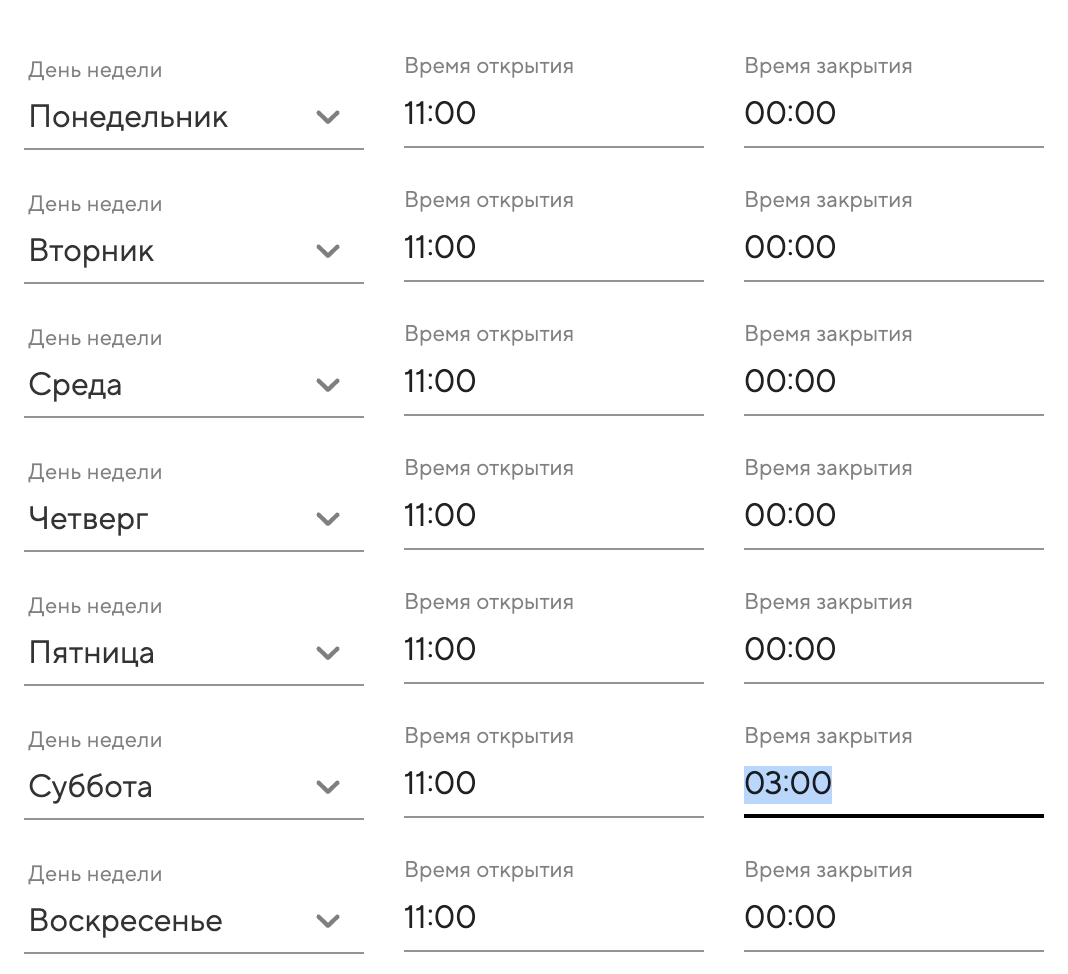 Если график работы меняется в зависимости от дня недели, нажмите «+ Добавить время», выберите день и укажите отдельные часы работы. Это подходит в случаях, если заведение работает дольше или меньше в определённые дни. Например, если в субботу заведение работает дольше: