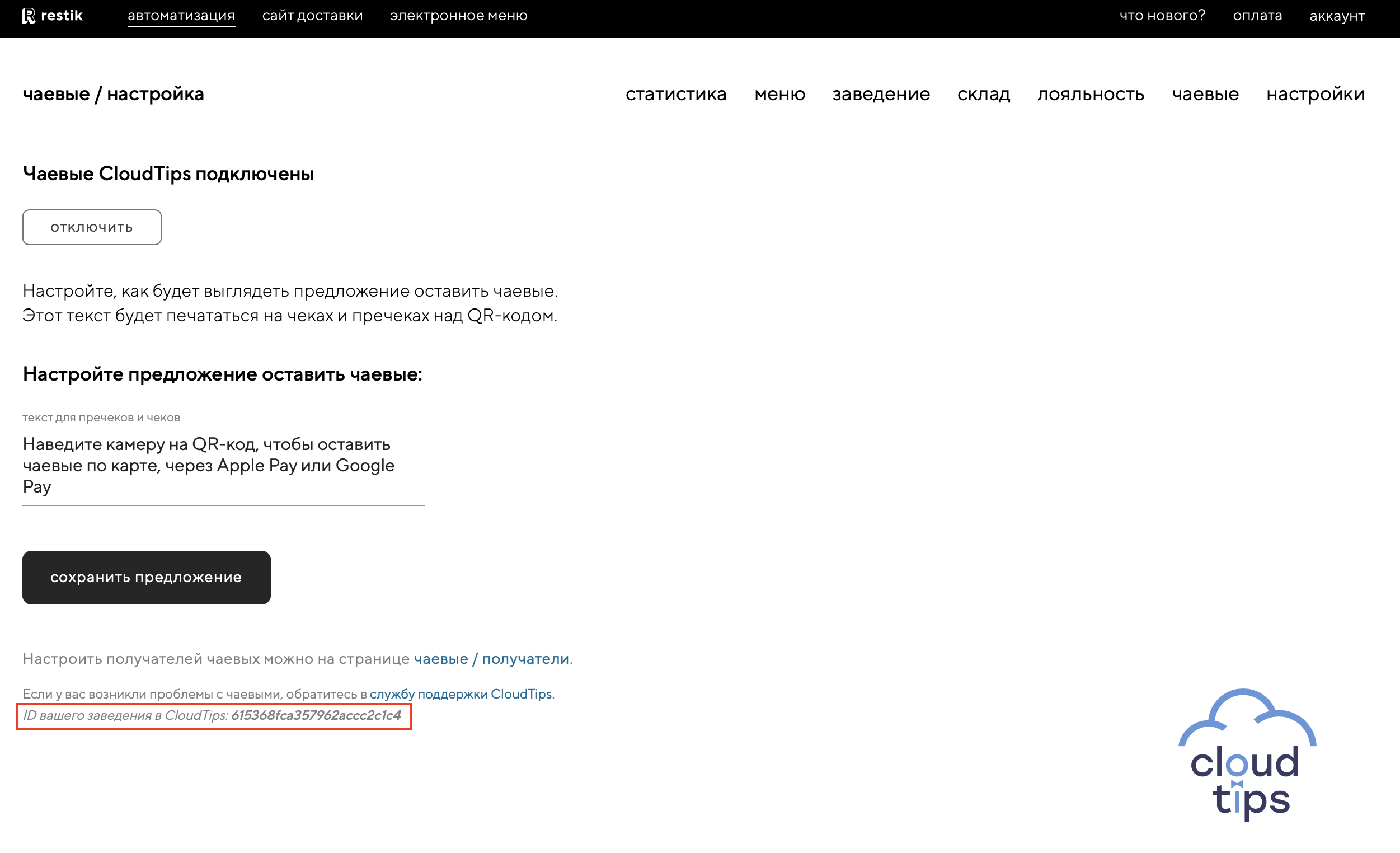Укажите в письме номер телефона получателя, а также ID вашего заведения, который вы можете найти внизу страницы настройки чаевых: