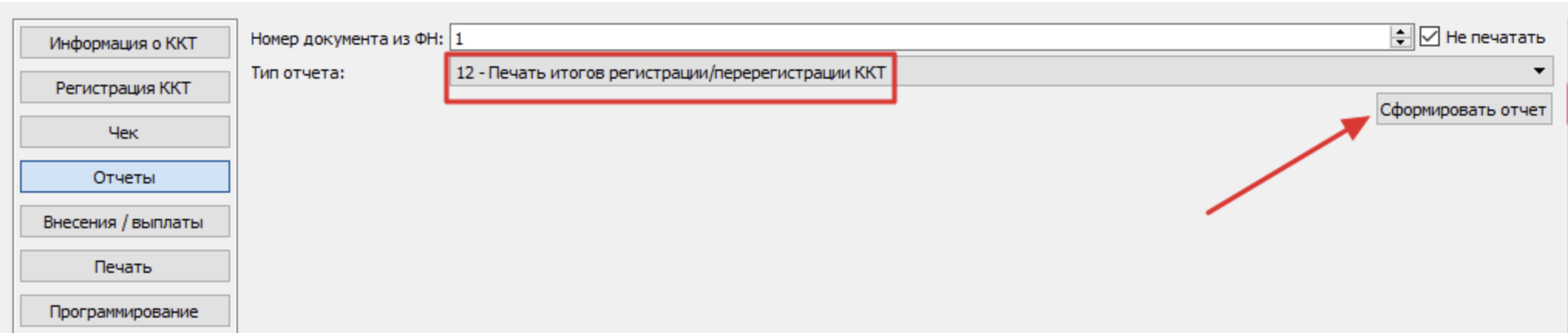 4. Выберите тип отчета «12 — Печать итогов регистрации/перерегистрации ККТ» и нажмите «Сформировать отчет».