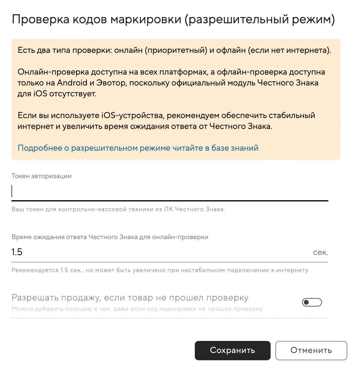 Как работать на iOS сейчас: офлайн-проверка требуется только в условиях нестабильного или отсутствующего интернета. Во всех остальных случаях проверка маркировки выполняется онлайн. Мы рекомендуем обеспечить стабильное подключение к интернету и увеличить время ожидания ответа от Честного Знака в настройках разрешительного режима.