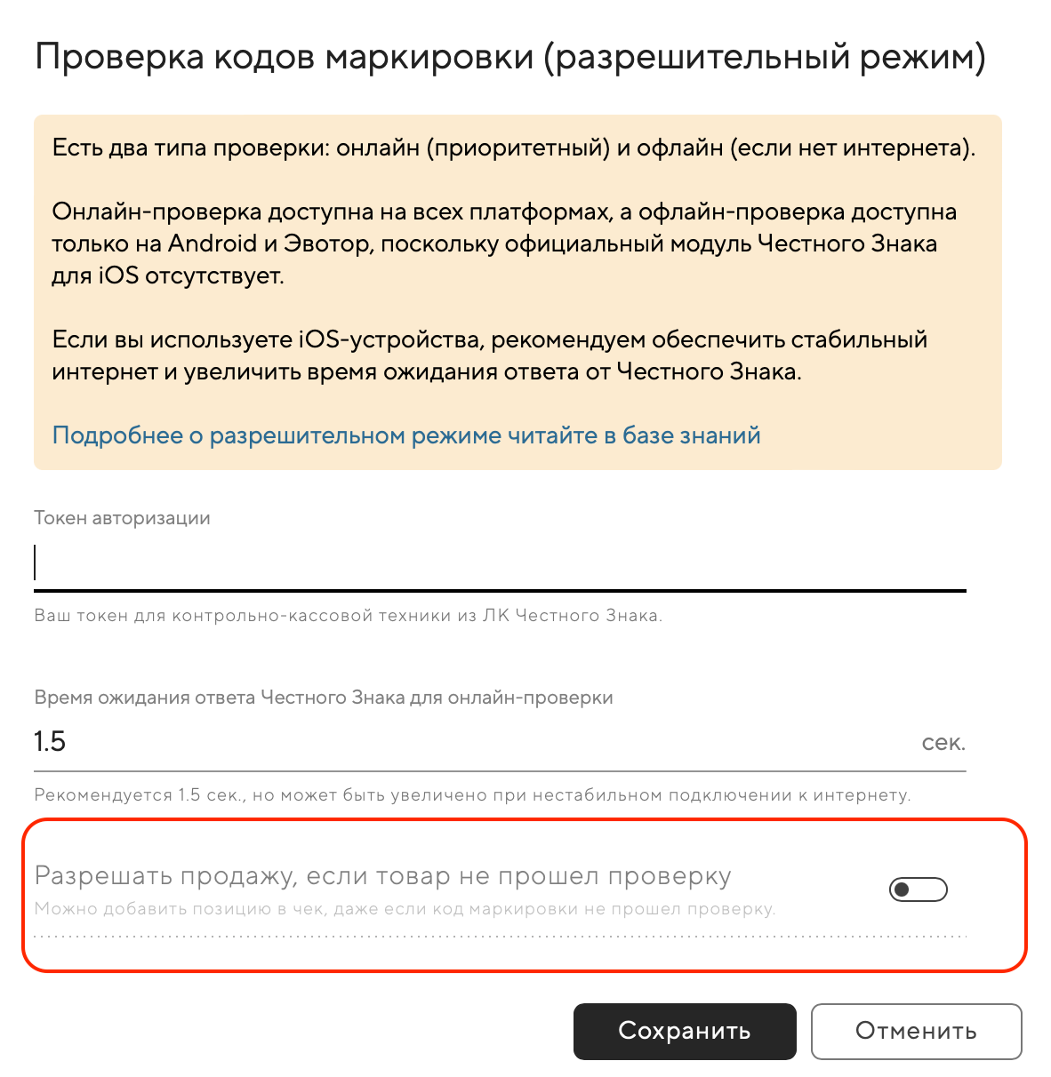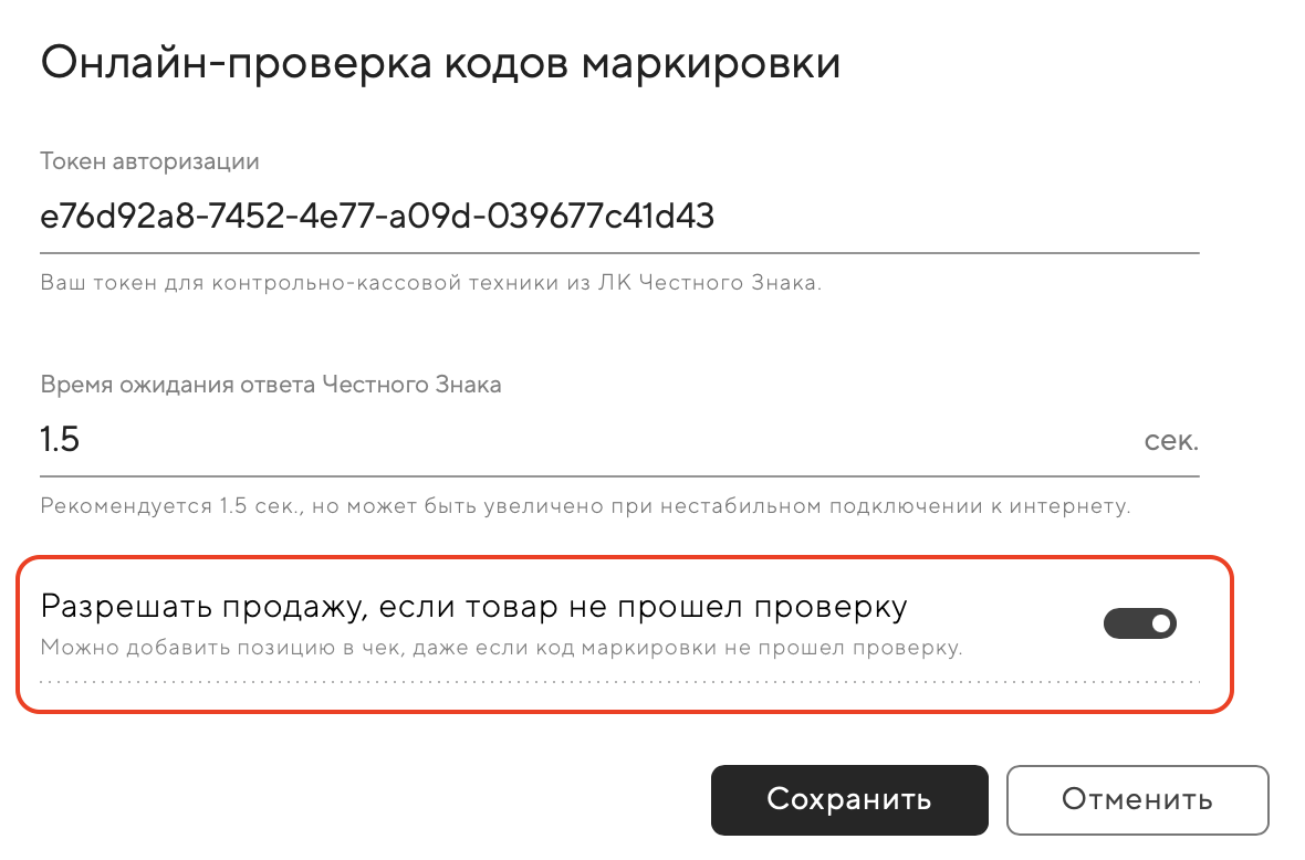 📢 Эта функция будет полезна при нестабильной работе ЧЗ или некорректных результатах проверки. Если все работает исправно, продавать товар, который не прошел проверку, — нарушение.