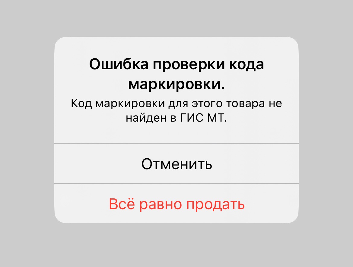 - на iOS: появится ошибка, товар нельзя будет добавить в чек, так как по закону обязательна офлайн-проверка, а на iOS она недоступна. В этом случае рекомендуется проверить подключение к интернету и убедиться, что VPN отключён, для перехода на онлайн-проверку. Если это невозможно, можно включить настройку «Разрешать продажу, если товар не прошёл проверку» и провести продажу без проверки, однако это может привести к штрафам.