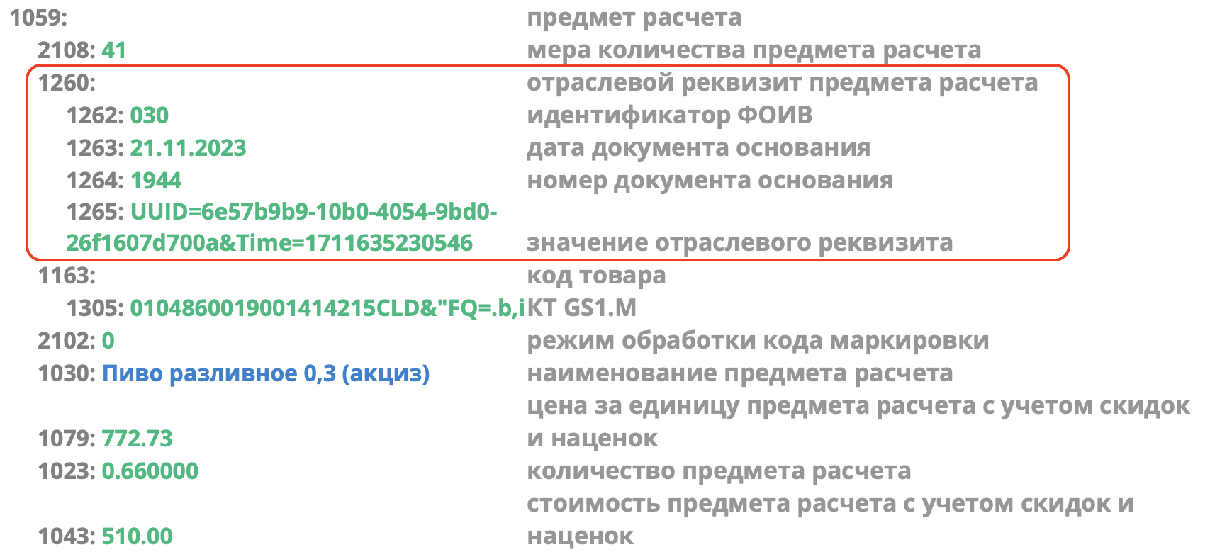 тег 1265 (значение отраслевого реквизита) — UUID и Time из атрибутов reqId и reqTimestamp ответа от сервиса Честного знака, если проверка выполнялась офлайн, также будут переданы идентификатор экземпляра ЛМ ЧЗ (inst) и версия базы, на которой осуществлялась проверка (version).